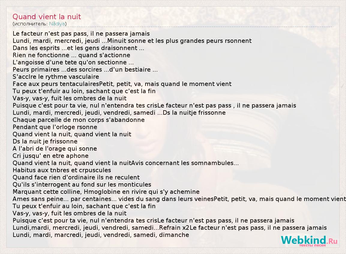 Le facteur n'est pas pass, il ne passera jamais Lundi, mardi, mercredi, jeudi ...Minuit sonne et les plus grandes peurs rsonnent Dans les esprits ...et les gens draisonnent ... Rien ne fonctionne ... quand s'actionne L'angoisse d'une tete qu'on sectionne ... Peurs primaires ...des sorcires ...d'un bestiaire ... S'acclre le rythme vasculaire Face aux peurs tentaculairesPetit, petit, va, mais quand le moment vient Tu peux t'enfuir au loin, sachant que c'est la fin Vas-y, vas-y, fuit les ombres de la nuit Puisque c'est pour ta vie, nul n'entendra tes crisLe facteur n'est pas pass , il ne passera jamais Lundi, mardi, mercredi, jeudi, vendredi, samedi ...Ds la nuitje frissonne Chaque parcelle de mon corps s'abandonne Pendant que l'orloge rsonne Quand vient la nuit, quand vient la nuit Ds la nuit je frissonne A l'abri de l'orage qui sonne Cri jusqu' en etre aphone Quand vient la nuit, quand vient la nuitAvis concernant les somnambules... Habitus aux tnbres et crpuscules Quand face rien d'ordinaire ils ne reculent Qu'ils s'interrogent au fond sur les monticules Marquant cette colline, Hmoglobine en rivire qui s'y achemine Ames sans peine... par centaines... vides du sang dans leurs veinesPetit, petit, va, mais quand le moment vient Tu peux t'enfuir au loin, sachant que c'est la fin Vas-y, vas-y, fuit les ombres de la nuit Puisque c'est pour ta vie, nul n'entendra tes crisLe facteur n'est pas pass, il ne passera jamais Lundi,mardi, mercredi, jeudi, vendredi, samedi...Refrain x2Le facteur n'est pas pass, il ne passera jamais Lundi, mardi, marcredi, jeudi, vendredi, samedi, dimanche