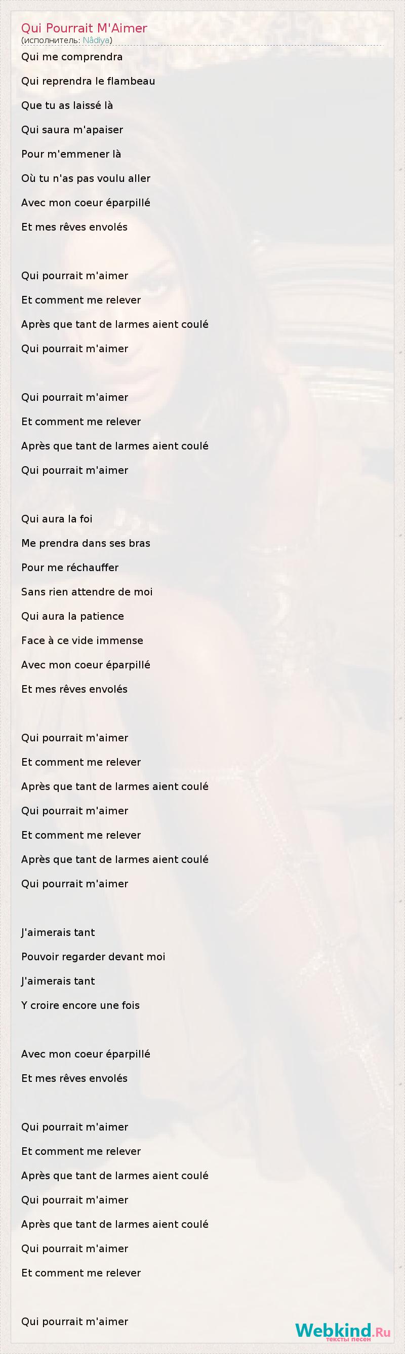 Qui me comprendra Qui reprendra le flambeau Que tu as laissé là Qui saura m'apaiser Pour m'emmener là Où tu n'as pas voulu aller Avec mon coeur éparpillé Et mes rêves envolés Qui pourrait m'aimer Et comment me relever Après que tant de larmes aient coulé Qui pourrait m'aimer Qui pourrait m'aimer Et comment me relever Après que tant de larmes aient coulé Qui pourrait m'aimer Qui aura la foi Me prendra dans ses bras Pour me réchauffer Sans rien attendre de moi Qui aura la patience Face à ce vide immense Avec mon coeur éparpillé Et mes rêves envolés Qui pourrait m'aimer Et comment me relever Après que tant de larmes aient coulé Qui pourrait m'aimer Et comment me relever Après que tant de larmes aient coulé Qui pourrait m'aimer J'aimerais tant Pouvoir regarder devant moi J'aimerais tant Y croire encore une fois Avec mon coeur éparpillé Et mes rêves envolés Qui pourrait m'aimer Et comment me relever Après que tant de larmes aient coulé Qui pourrait m'aimer Après que tant de larmes aient coulé Qui pourrait m'aimer Et comment me relever Qui pourrait m'aimer