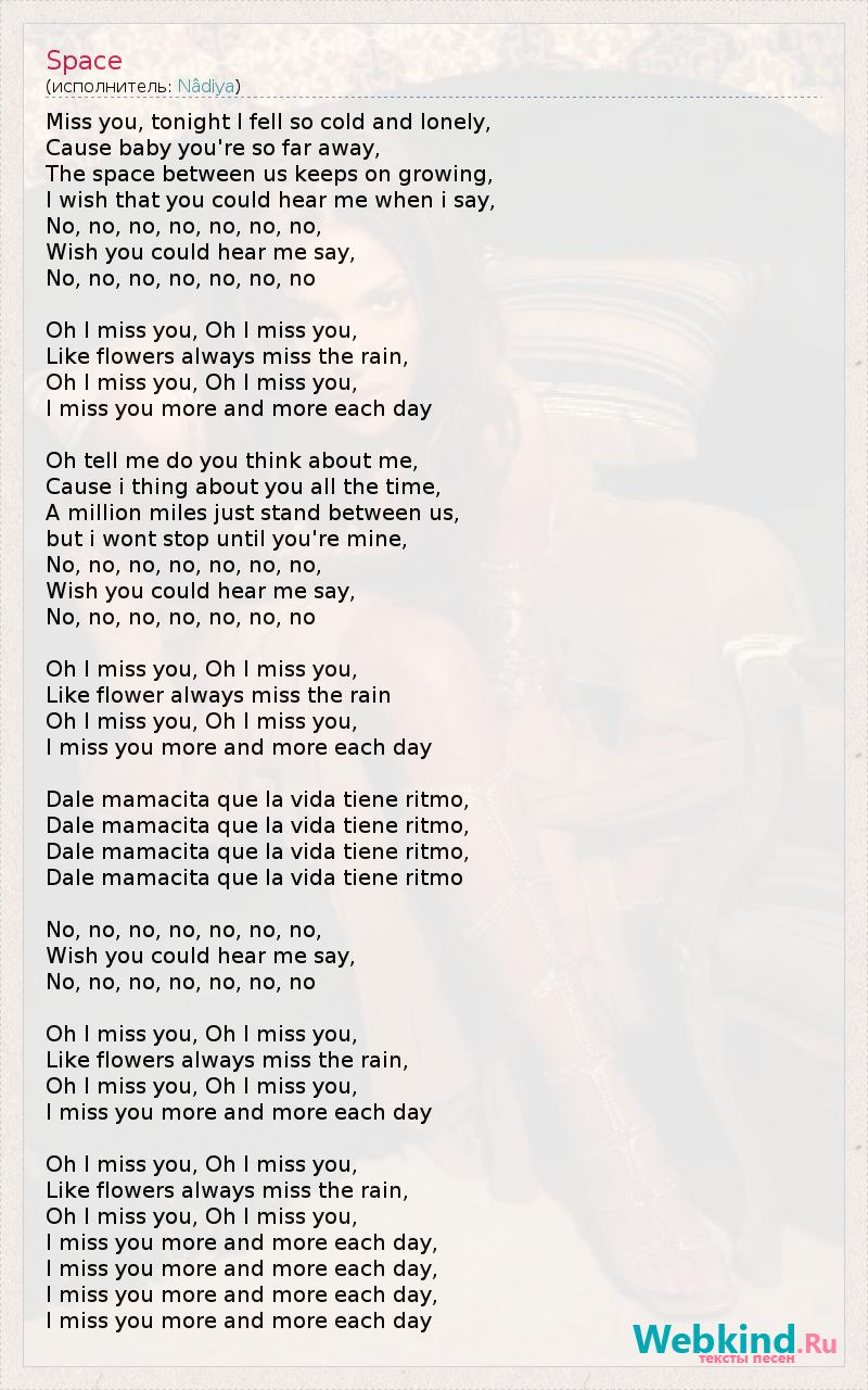 Miss you, tonight I fell so cold and lonely, Cause baby you're so far away, The space between us keeps on growing, I wish that you could hear me when i say, No, no, no, no, no, no, no, Wish you could hear me say, No, no, no, no, no, no, no Oh I miss you, Oh I miss you, Like flowers always miss the rain, Oh I miss you, Oh I miss you, I miss you more and more each day Oh tell me do you think about me, Cause i thing about you all the time, A million miles just stand between us, but i wont stop until you're mine, No, no, no, no, no, no, no, Wish you could hear me say, No, no, no, no, no, no, no Oh I miss you, Oh I miss you, Like flower always miss the rain Oh I miss you, Oh I miss you, I miss you more and more each day Dale mamacita que la vida tiene ritmo, Dale mamacita que la vida tiene ritmo, Dale mamacita que la vida tiene ritmo, Dale mamacita que la vida tiene ritmo No, no, no, no, no, no, no, Wish you could hear me say, No, no, no, no, no, no, no Oh I miss you, Oh I miss you, Like flowers always miss the rain, Oh I miss you, Oh I miss you, I miss you more and more each day Oh I miss you, Oh I miss you, Like flowers always miss the rain, Oh I miss you, Oh I miss you, I miss you more and more each day, I miss you more and more each day, I miss you more and more each day, I miss you more and more each day