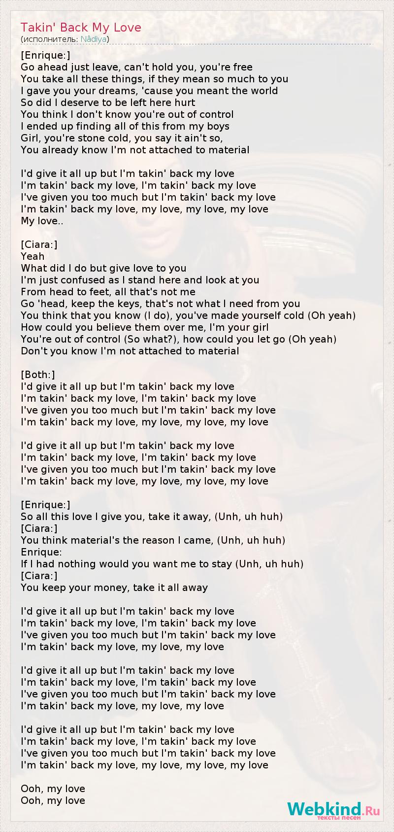 [Enrique:] Go ahead just leave, can't hold you, you're free You take all these things, if they mean so much to you I gave you your dreams, 'cause you meant the world So did I deserve to be left here hurt You think I don't know you're out of control I ended up finding all of this from my boys Girl, you're stone cold, you say it ain't so, You already know I'm not attached to material I'd give it all up but I'm takin' back my love I'm takin' back my love, I'm takin' back my love I've given you too much but I'm takin' back my love I'm takin' back my love, my love, my love, my love My love.. [Ciara:] Yeah What did I do but give love to you I'm just confused as I stand here and look at you From head to feet, all that's not me Go 'head, keep the keys, that's not what I need from you You think that you know (I do), you've made yourself cold (Oh yeah) How could you believe them over me, I'm your girl You're out of control (So what?), how could you let go (Oh yeah) Don't you know I'm not attached to material [Both:] I'd give it all up but I'm takin' back my love I'm takin' back my love, I'm takin' back my love I've given you too much but I'm takin' back my love I'm takin' back my love, my love, my love, my love I'd give it all up but I'm takin' back my love I'm takin' back my love, I'm takin' back my love I've given you too much but I'm takin' back my love I'm takin' back my love, my love, my love, my love [Enrique:] So all this love I give you, take it away, (Unh, uh huh) [Ciara:] You think material's the reason I came, (Unh, uh huh) Enrique: If I had nothing would you want me to stay (Unh, uh huh) [Ciara:] You keep your money, take it all away I'd give it all up but I'm takin' back my love I'm takin' back my love, I'm takin' back my love I've given you too much but I'm takin' back my love I'm takin' back my love, my love, my love I'd give it all up but I'm takin' back my love I'm takin' back my love, I'm takin' back my love I've given you too much but I'm takin' back my love I'm takin' back my love, my love, my love I'd give it all up but I'm takin' back my love I'm takin' back my love, I'm takin' back my love I've given you too much but I'm takin' back my love I'm takin' back my love, my love, my love, my love Ooh, my love Ooh, my love