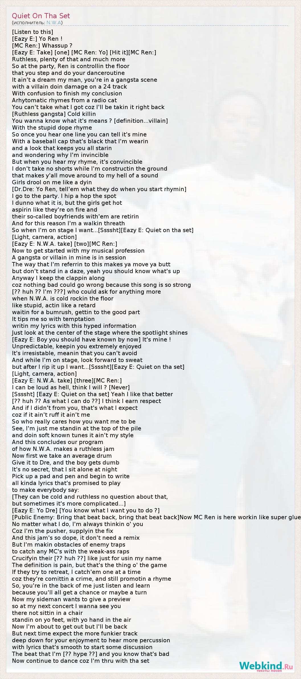 [Listen to this] [Eazy E:] Yo Ren ! [MC Ren:] Whassup ? [Eazy E: Take] [one] [MC Ren: Yo] [Hit it][MC Ren:] Ruthless, plenty of that and much more So at the party, Ren is controllin the floor that you step and do your danceroutine It ain't a dream my man, you're in a gangsta scene with a villain doin damage on a 24 track With confusion to finish my conclusion Arhytomatic rhymes from a radio cat You can't take what I got coz I'll be takin it right back [Ruthless gangsta] Cold killin You wanna know what it's means ? [definition...villain] With the stupid dope rhyme So once you hear one line you can tell it's mine With a baseball cap that's black that I'm wearin and a look that keeps you all starin and wondering why I'm invincible But when you hear my rhyme, it's convincible I don't take no shorts while I'm constructin the ground that makes y'all move around to my hell of a sound Girls drool on me like a dyin [Dr.Dre: Yo Ren, tell'em what they do when you start rhymin] I go to the party. I hip a hop the spot I dunno what it is, but the girls get hot aspirin like they're on fire and their so-called boyfriends with'em are retirin And for this reason I'm a walkin threath So when I'm on stage I want...[Ssssht][Eazy E: Quiet on tha set] [Light, camera, action] [Eazy E: N.W.A. take] [two][MC Ren:] Now to get started with my musical profession A gangsta or villain in mine is in session The way that I'm referrin to this makes ya move ya butt but don't stand in a daze, yeah you should know what's up Anyway I keep the clappin along coz nothing bad could go wrong because this song is so strong [?? huh ?? I'm ???] who could ask for anything more when N.W.A. is cold rockin the floor like stupid, actin like a retard waitin for a bumrush, gettin to the good part It tips me so with temptation writin my lyrics with this hyped information Just look at the center of the stage where the spotlight shines [Eazy E: Boy you should have known by now] It's mine ! Unpredictable, keepin you extremely enjoyed It's irresistable, meanin that you can't avoid And while I'm on stage, look forward to sweat but after I rip it up I want...[Ssssht][Eazy E: Quiet on tha set] [Light, camera, action] [Eazy E: N.W.A. take] [three][MC Ren:] I can be loud as hell, think I will ? [Never] [Ssssht] [Eazy E: Quiet on tha set] Yeah I like that better [?? huh ?? As what I can do ??] I think I earn respect And if I didn't from you, that's what I expect coz if it ain't ruff it ain't me So who really cares how you want me to be See, I'm just me standin at the top of the pile and doin soft known tunes it ain't my style And this concludes our program of how N.W.A. makes a ruthless jam Now first we take an average drum Give it to Dre, and the boy gets dumb It's no secret, that I sit alone at night Pick up a pad and pen and begin to write all kinda lyrics that's promised to play to make everybody say: [They can be cold and ruthless no question about that, but sometimes it's more complicated...] [Eazy E: Yo Dre] [You know what I want you to do ?] [Public Enemy: Bring that beat back, bring that beat back]Now MC Ren is here workin like super glue No matter what I do, I'm always thinkin o' you Coz I'm the pusher, supplyin the fix And this jam's so dope, it don't need a remix But I'm makin obstacles of enemy traps to catch any MC's with the weak-ass raps Crucifyin their [?? huh ??] like just for usin my name The definition is pain, but that's the thing o' the game If they try to retreat, I catch'em one at a time coz they're comittin a crime, and still promotin a rhyme So, you're in the back of me just listen and learn because you'll all get a chance or maybe a turn Now my sideman wants to give a preview so at my next concert I wanna see you there not sittin in a chair standin on yo feet, with yo hand in the air Now I'm about to get out but I'll be back But next time expect the more funkier track deep down for your enjoyment to hear more percussion with lyrics that's smooth to start some discussion The beat that I'm [?? hype ??] and you know that's bad Now continue to dance coz I'm thru with tha set