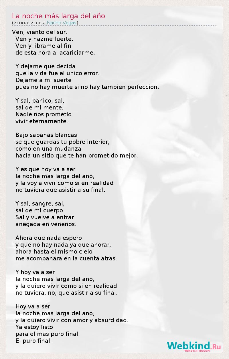Ven, viento del sur. Ven y hazme fuerte. Ven y librame al fin de esta hora al acariciarme. Y dejame que decida que la vida fue el unico error. Dejame a mi suerte pues no hay muerte si no hay tambien perfeccion. Y sal, panico, sal, sal de mi mente. Nadie nos prometio vivir eternamente. Bajo sabanas blancas se que guardas tu pobre interior, como en una mudanza hacia un sitio que te han prometido mejor. Y es que hoy va a ser la noche mas larga del ano, y la voy a vivir como si en realidad no tuviera que asistir a su final. Y sal, sangre, sal, sal de mi cuerpo. Sal y vuelve a entrar anegada en venenos. Ahora que nada espero y que no hay nada ya que anorar, ahora hasta el mismo cielo me acompanara en la cuenta atras. Y hoy va a ser la noche mas larga del ano, y la quiero vivir como si en realidad no tuviera, no, que asistir a su final. Hoy va a ser la noche mas larga del ano, y la quiero vivir con amor y absurdidad. Ya estoy listo para el mas puro final. El puro final.