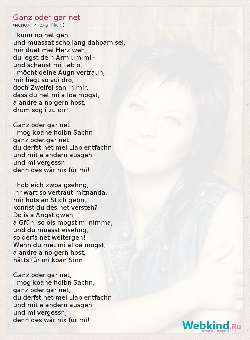 I konn no net geh und müassat scho lang dahoam sei, mir duat mei Herz weh, du legst dein Arm um mi - und schaust mi liab o, i möcht deine Augn vertraun, mir liegt so vui dro, doch Zweifel san in mir, dass du net mi alloa mogst, a andre a no gern host, drum sog i zu dir: Ganz oder gar net I mog koane hoibn Sachn ganz oder gar net du derfst net mei Liab entfachn und mit a andern ausgeh und mi vergessn denn des wär nix für mi! I hob eich zwoa gsehng, ihr wart so vertraut mitnanda, mir hots an Stich gebn, konnst du des net versteh? Do is a Angst gwen, a Gfühl so ois mogst mi nimma, und du muasst eisehng, so derfs net weitergeh! Wenn du met mi alloa mogst, a andre a no gern host, hätts für mi koan Sinn! Ganz oder gar net, i mog koane hoibn Sachn, ganz oder gar net, du derfst net mei Liab entfachn und mit a andern ausgeh und mi vergessn, denn des wär nix für mi!