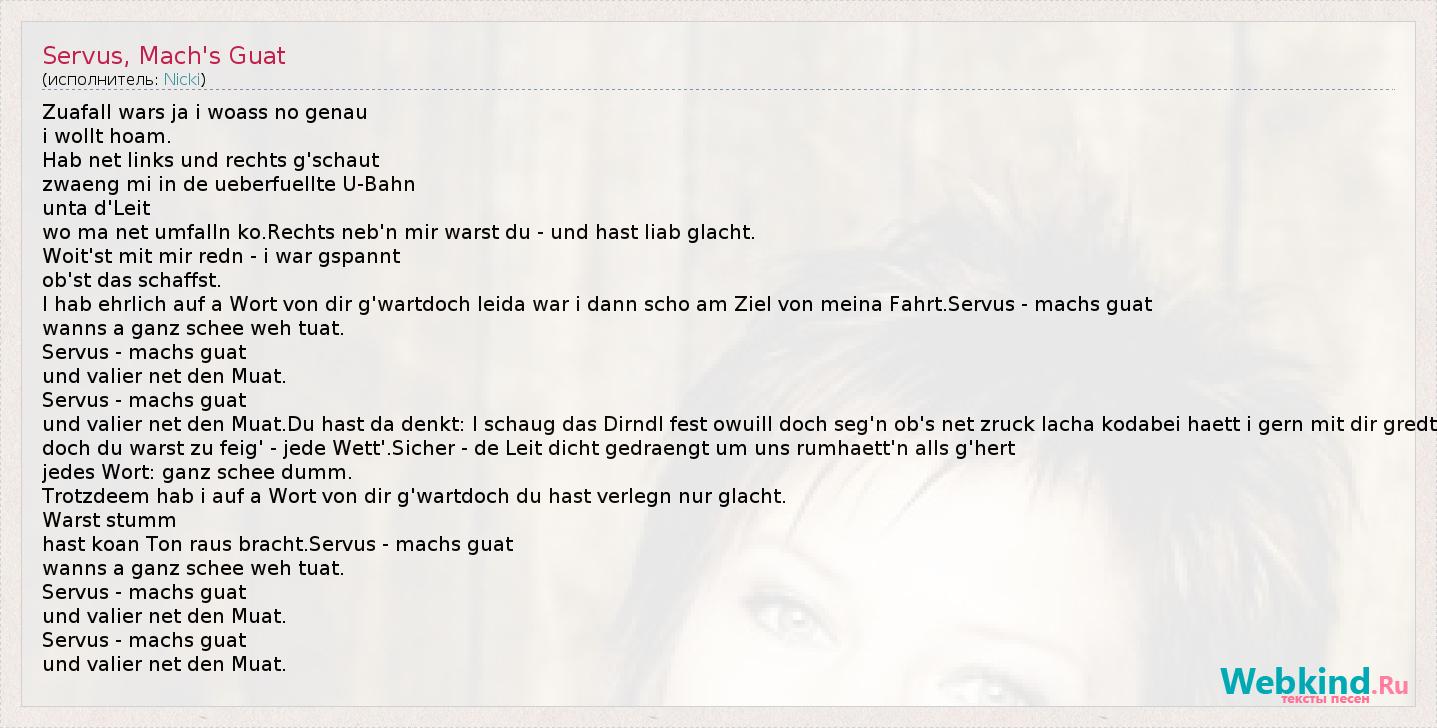 Zuafall wars ja i woass no genau i wollt hoam. Hab net links und rechts g'schaut zwaeng mi in de ueberfuellte U-Bahn unta d'Leit wo ma net umfalln ko.Rechts neb'n mir warst du - und hast liab glacht. Woit'st mit mir redn - i war gspannt ob'st das schaffst. I hab ehrlich auf a Wort von dir g'wartdoch leida war i dann scho am Ziel von meina Fahrt.Servus - machs guat wanns a ganz schee weh tuat. Servus - machs guat und valier net den Muat. Servus - machs guat und valier net den Muat.Du hast da denkt: I schaug das Dirndl fest owuill doch seg'n ob's net zruck lacha kodabei haett i gern mit dir gredt doch du warst zu feig' - jede Wett'.Sicher - de Leit dicht gedraengt um uns rumhaett'n alls g'hert jedes Wort: ganz schee dumm. Trotzdeem hab i auf a Wort von dir g'wartdoch du hast verlegn nur glacht. Warst stumm hast koan Ton raus bracht.Servus - machs guat wanns a ganz schee weh tuat. Servus - machs guat und valier net den Muat. Servus - machs guat und valier net den Muat.