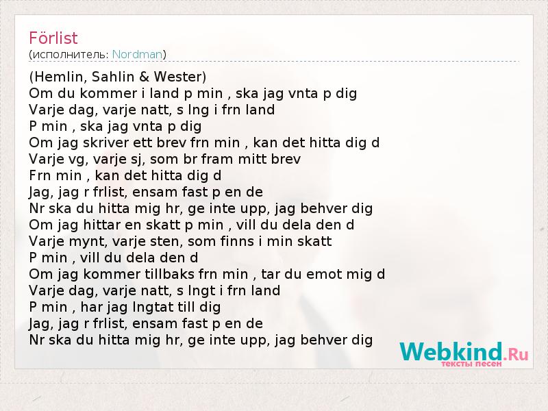 (Hemlin, Sahlin & Wester) Om du kommer i land p min , ska jag vnta p dig Varje dag, varje natt, s lng i frn land P min , ska jag vnta p dig Om jag skriver ett brev frn min , kan det hitta dig d Varje vg, varje sj, som br fram mitt brev Frn min , kan det hitta dig d Jag, jag r frlist, ensam fast p en de Nr ska du hitta mig hr, ge inte upp, jag behver dig Om jag hittar en skatt p min , vill du dela den d Varje mynt, varje sten, som finns i min skatt P min , vill du dela den d Om jag kommer tillbaks frn min , tar du emot mig d Varje dag, varje natt, s lngt i frn land P min , har jag lngtat till dig Jag, jag r frlist, ensam fast p en de Nr ska du hitta mig hr, ge inte upp, jag behver dig