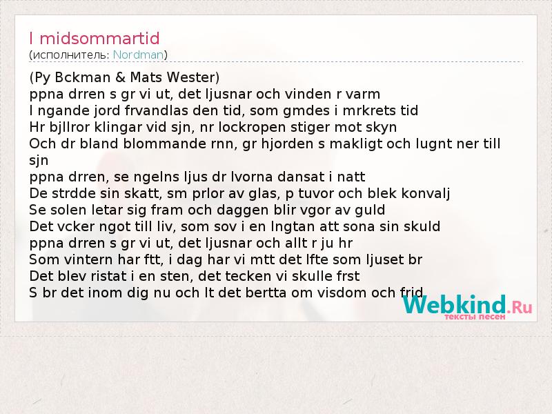 Это интересно:Nordman шведская группа, основанная в 1993 году. Стиль смешивает в себе народную, рок и поп музыку. Этот жанр называется etnorock или folkrock на шведском языке.Группу составляют Håkan Hemlin, как певец и лидер группы, и Mats Wester, который играет на никельхарпе.Хитами группы были Förlist ("Кораблекрушение") и Vandraren ("Странник"). Группа распалась в 1998 из-за... продолжение