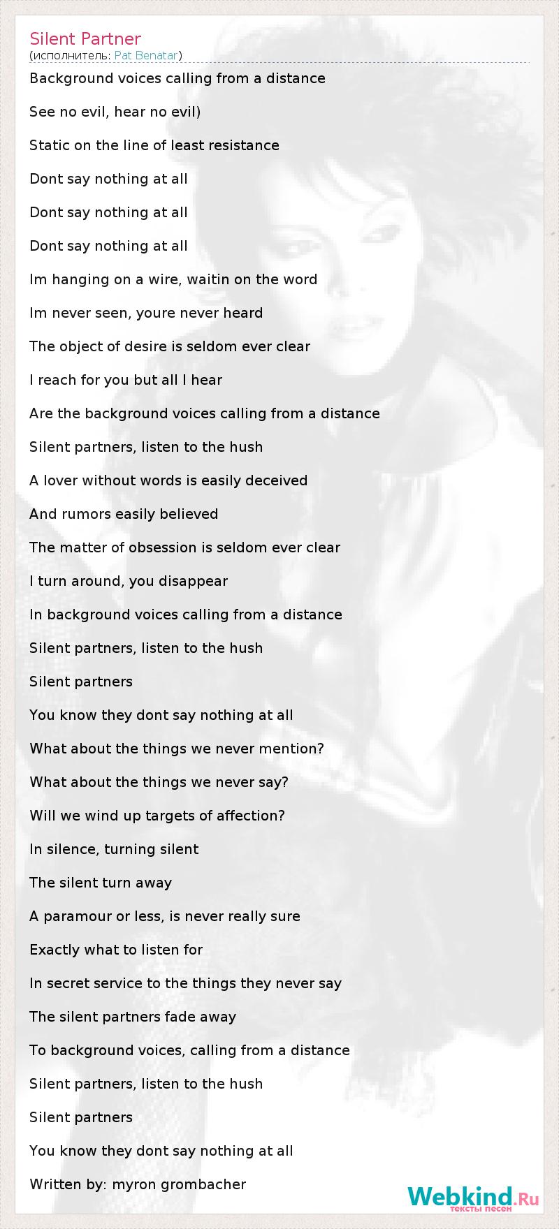 Background voices calling from a distance See no evil, hear no evil) Static on the line of least resistance Dont say nothing at all Dont say nothing at all Dont say nothing at all Im hanging on a wire, waitin on the word Im never seen, youre never heard The object of desire is seldom ever clear I reach for you but all I hear Are the background voices calling from a distance Silent partners, listen to the hush A lover without words is easily deceived And rumors easily believed The matter of obsession is seldom ever clear I turn around, you disappear In background voices calling from a distance Silent partners, listen to the hush Silent partners You know they dont say nothing at all What about the things we never mention? What about the things we never say? Will we wind up targets of affection? In silence, turning silent The silent turn away A paramour or less, is never really sure Exactly what to listen for In secret service to the things they never say The silent partners fade away To background voices, calling from a distance Silent partners, listen to the hush Silent partners You know they dont say nothing at all Written by: myron grombacher