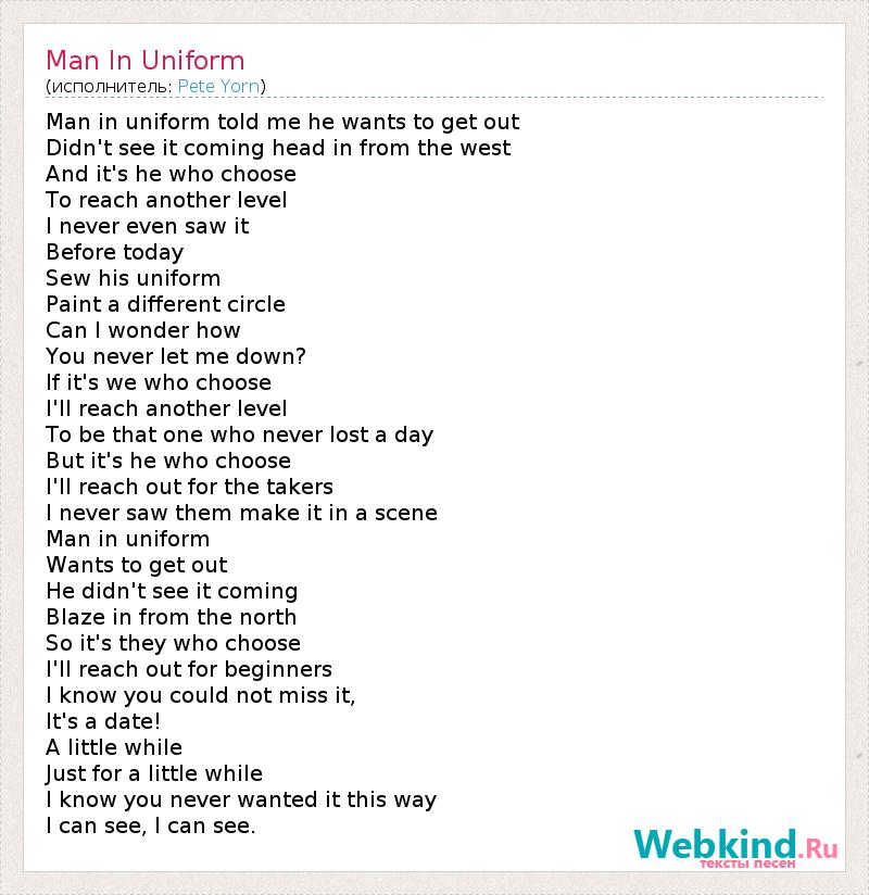 Man in uniform told me he wants to get out Didn't see it coming head in from the west And it's he who choose To reach another level I never even saw it Before today Sew his uniform Paint a different circle Can I wonder how You never let me down? If it's we who choose I'll reach another level To be that one who never lost a day But it's he who choose I'll reach out for the takers I never saw them make it in a scene Man in uniform Wants to get out He didn't see it coming Blaze in from the north So it's they who choose I'll reach out for beginners I know you could not miss it, It's a date! A little while Just for a little while I know you never wanted it this way I can see, I can see.