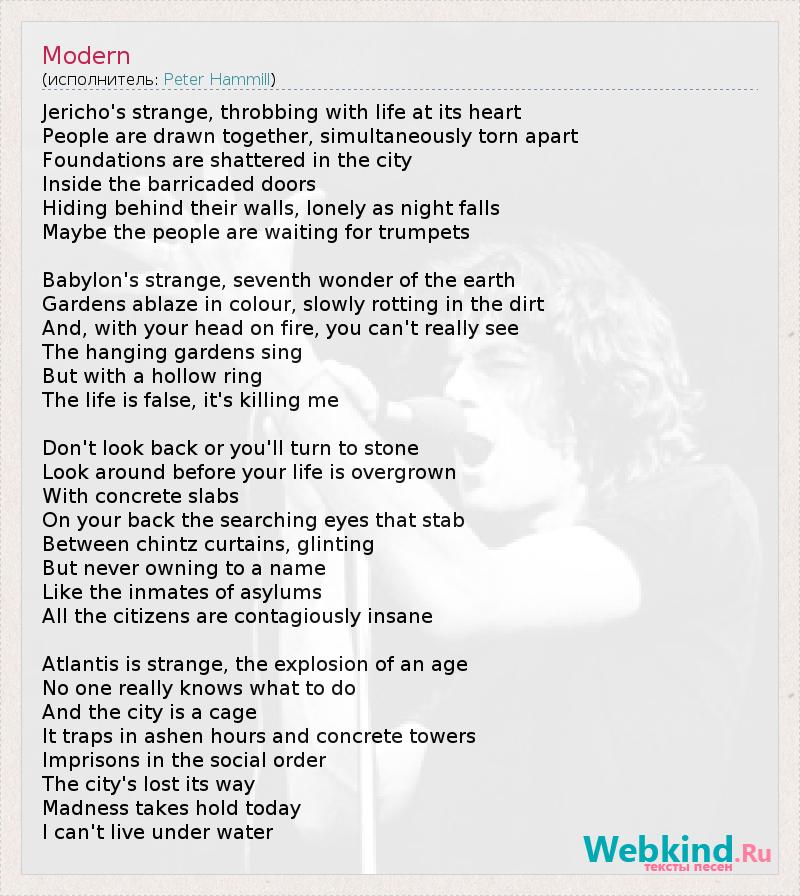 Jericho's strange, throbbing with life at its heart People are drawn together, simultaneously torn apart Foundations are shattered in the city Inside the barricaded doors Hiding behind their walls, lonely as night falls Maybe the people are waiting for trumpets Babylon's strange, seventh wonder of the earth Gardens ablaze in colour, slowly rotting in the dirt And, with your head on fire, you can't really see The hanging gardens sing But with a hollow ring The life is false, it's killing me Don't look back or you'll turn to stone Look around before your life is overgrown With concrete slabs On your back the searching eyes that stab Between chintz curtains, glinting But never owning to a name Like the inmates of asylums All the citizens are contagiously insane Atlantis is strange, the explosion of an age No one really knows what to do And the city is a cage It traps in ashen hours and concrete towers Imprisons in the social order The city's lost its way Madness takes hold today I can't live under water