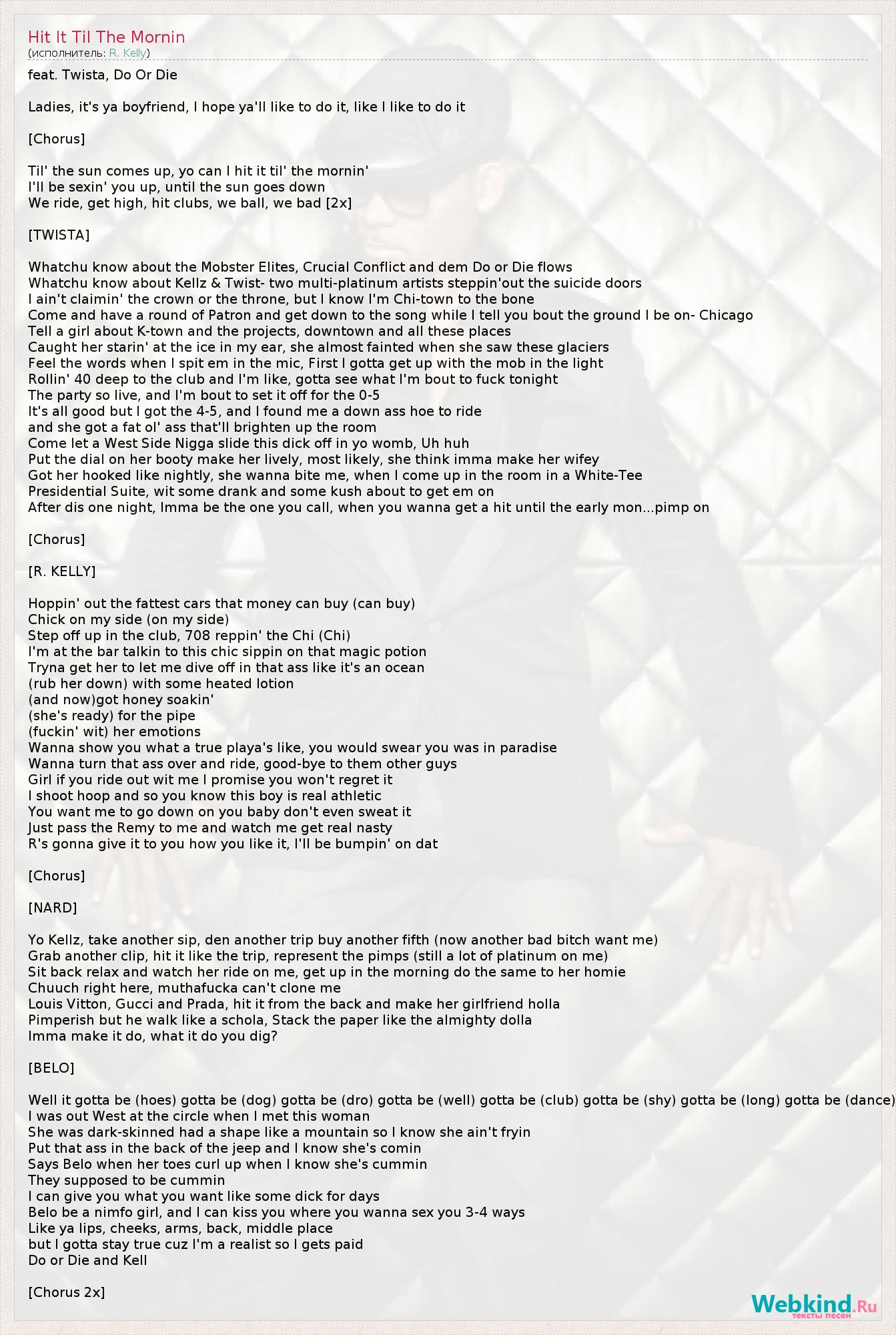 feat. Twista, Do Or Die Ladies, it's ya boyfriend, I hope ya'll like to do it, like I like to do it [Chorus] Til' the sun comes up, yo can I hit it til' the mornin' I'll be sexin' you up, until the sun goes down We ride, get high, hit clubs, we ball, we bad [2x] [TWISTA] Whatchu know about the Mobster Elites, Crucial Conflict and dem Do or Die flows Whatchu know about Kellz & Twist- two multi-platinum artists steppin'out the suicide doors I ain't claimin' the crown or the throne, but I know I'm Chi-town to the bone Come and have a round of Patron and get down to the song while I tell you bout the ground I be on- Chicago Tell a girl about K-town and the projects, downtown and all these places Caught her starin' at the ice in my ear, she almost fainted when she saw these glaciers Feel the words when I spit em in the mic, First I gotta get up with the mob in the light Rollin' 40 deep to the club and I'm like, gotta see what I'm bout to fuck tonight The party so live, and I'm bout to set it off for the 0-5 It's all good but I got the 4-5, and I found me a down ass hoe to ride and she got a fat ol' ass that'll brighten up the room Come let a West Side Nigga slide this dick off in yo womb, Uh huh Put the dial on her booty make her lively, most likely, she think imma make her wifey Got her hooked like nightly, she wanna bite me, when I come up in the room in a White-Tee Presidential Suite, wit some drank and some kush about to get em on After dis one night, Imma be the one you call, when you wanna get a hit until the early mon...pimp on [Chorus] [R. KELLY] Hoppin' out the fattest cars that money can buy (can buy) Chick on my side (on my side) Step off up in the club, 708 reppin' the Chi (Chi) I'm at the bar talkin to this chic sippin on that magic potion Tryna get her to let me dive off in that ass like it's an ocean (rub her down) with some heated lotion (and now)got honey soakin' (she's ready) for the pipe (fuckin' wit) her emotions Wanna show you what a true playa's like, you would swear you was in paradise Wanna turn that ass over and ride, good-bye to them other guys Girl if you ride out wit me I promise you won't regret it I shoot hoop and so you know this boy is real athletic You want me to go down on you baby don't even sweat it Just pass the Remy to me and watch me get real nasty R's gonna give it to you how you like it, I'll be bumpin' on dat [Chorus] [NARD] Yo Kellz, take another sip, den another trip buy another fifth (now another bad bitch want me) Grab another clip, hit it like the trip, represent the pimps (still a lot of platinum on me) Sit back relax and watch her ride on me, get up in the morning do the same to her homie Chuuch right here, muthafucka can't clone me Louis Vitton, Gucci and Prada, hit it from the back and make her girlfriend holla Pimperish but he walk like a schola, Stack the paper like the almighty dolla Imma make it do, what it do you dig? [BELO] Well it gotta be (hoes) gotta be (dog) gotta be (dro) gotta be (well) gotta be (club) gotta be (shy) gotta be (long) gotta be (dance) I was out West at the circle when I met this woman She was dark-skinned had a shape like a mountain so I know she ain't fryin Put that ass in the back of the jeep and I know she's comin Says Belo when her toes curl up when I know she's cummin They supposed to be cummin I can give you what you want like some dick for days Belo be a nimfo girl, and I can kiss you where you wanna sex you 3-4 ways Like ya lips, cheeks, arms, back, middle place but I gotta stay true cuz I'm a realist so I gets paid Do or Die and Kell [Chorus 2x]