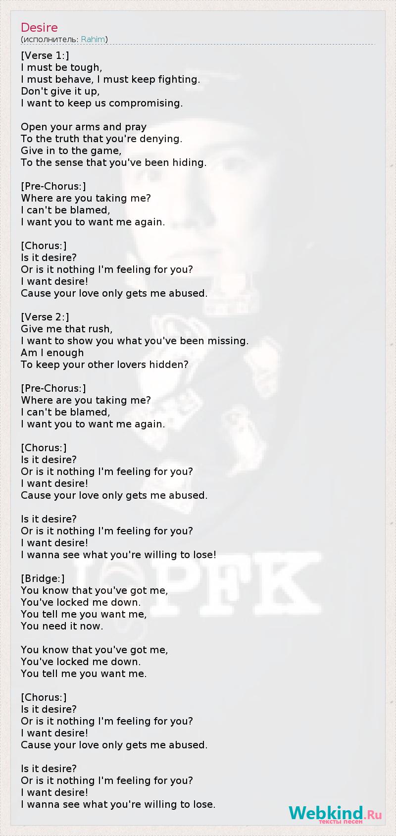 [Куплет 1:] Я должен быть стойким, Я должен хорошо держаться и продолжать бороться. Не сдавайся, Я хочу, чтоб мы продолжали поиск компромисса. Раскрой ладони и молись Правде, которую отрицаешь. Погрузись в игру, Отдайся чувству, которое скрываешь. [Распевка:] Куда ты ведешь меня? Меня нельзя винить, Я хочу, чтобы ты снова меня хотела. [Припев:] Это желание? Или я не чувствую к тебе ничего существенного? Я хочу страсти, Потому что твоя любовь лишь терзает меня. [Куплет 2:] Дай мне тот порыв, Я хочу показать тебе, что ты теряешь. Достаточно ли меня, Чтобы другие твои любовники так и остались невидимыми? [Распевка:] Куда ты ведешь меня? Меня нельзя винить, Я хочу, чтобы ты снова меня хотела. [Припев:] Это желание? Или я не чувствую к тебе ничего существенного? Я хочу страсти, Потому что твоя любовь лишь терзает меня. Это желание? Или я не чувствую к тебе ничего существенного? Я хочу страсти, Я хочу увидеть, чтó ты готова потерять. [Связка:] Ты знаешь, что у тебя есть я, Ты приковала меня. Ты говоришь, что хочешь меня, Сейчас ты нуждаешься в этом. Ты знаешь, что у тебя есть я, Ты приковала меня Ты говоришь, что хочешь меня... [Припев:] Это желание? Или я не чувствую к тебе ничего существенного? Я хочу страсти, Потому что твоя любовь лишь терзает меня. Это желание? Или я не чувствую к тебе ничего существенного? Я хочу страсти, Я хочу увидеть, чтó ты готова потерять.