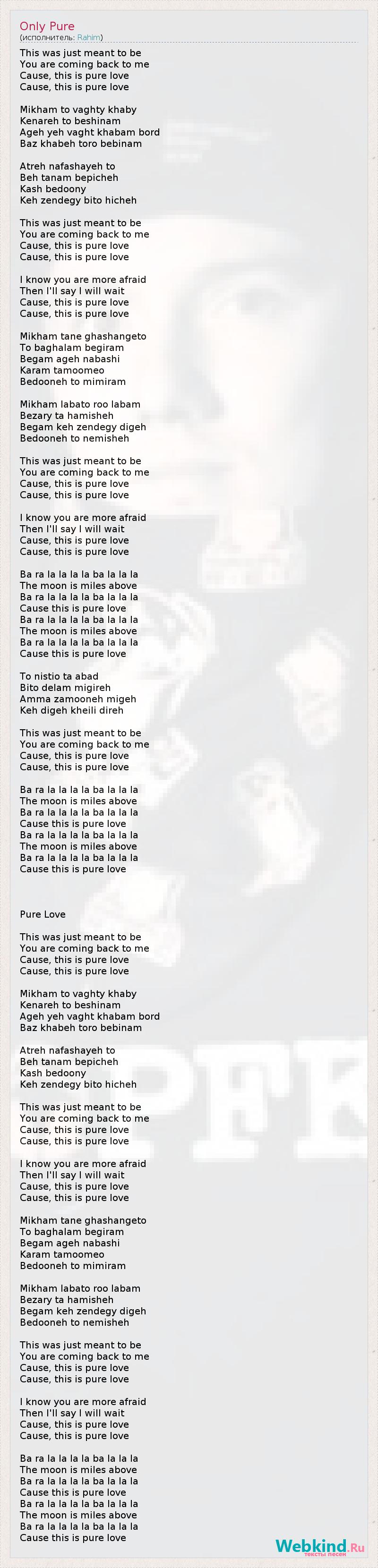 This was just meant to be You are coming back to me Cause, this is pure love Cause, this is pure love Mikham to vaghty khaby Kenareh to beshinam Ageh yeh vaght khabam bord Baz khabeh toro bebinam Atreh nafashayeh to Beh tanam bepicheh Kash bedoony Keh zendegy bito hicheh This was just meant to be You are coming back to me Cause, this is pure love Cause, this is pure love I know you are more afraid Then I'll say I will wait Cause, this is pure love Cause, this is pure love Mikham tane ghashangeto To baghalam begiram Begam ageh nabashi Karam tamoomeo Bedooneh to mimiram Mikham labato roo labam Bezary ta hamisheh Begam keh zendegy digeh Bedooneh to nemisheh This was just meant to be You are coming back to me Cause, this is pure love Cause, this is pure love I know you are more afraid Then I'll say I will wait Cause, this is pure love Cause, this is pure love Ba ra la la la la ba la la la The moon is miles above Ba ra la la la la ba la la la Cause this is pure love Ba ra la la la la ba la la la The moon is miles above Ba ra la la la la ba la la la Cause this is pure love To nistio ta abad Bito delam migireh Amma zamooneh migeh Keh digeh kheili direh This was just meant to be You are coming back to me Cause, this is pure love Cause, this is pure love Ba ra la la la la ba la la la The moon is miles above Ba ra la la la la ba la la la Cause this is pure love Ba ra la la la la ba la la la The moon is miles above Ba ra la la la la ba la la la Cause this is pure love Pure Love This was just meant to be You are coming back to me Cause, this is pure love Cause, this is pure love Mikham to vaghty khaby Kenareh to beshinam Ageh yeh vaght khabam bord Baz khabeh toro bebinam Atreh nafashayeh to Beh tanam bepicheh Kash bedoony Keh zendegy bito hicheh This was just meant to be You are coming back to me Cause, this is pure love Cause, this is pure love I know you are more afraid Then I'll say I will wait Cause, this is pure love Cause, this is pure love Mikham tane ghashangeto To baghalam begiram Begam ageh nabashi Karam tamoomeo Bedooneh to mimiram Mikham labato roo labam Bezary ta hamisheh Begam keh zendegy digeh Bedooneh to nemisheh This was just meant to be You are coming back to me Cause, this is pure love Cause, this is pure love I know you are more afraid Then I'll say I will wait Cause, this is pure love Cause, this is pure love Ba ra la la la la ba la la la The moon is miles above Ba ra la la la la ba la la la Cause this is pure love Ba ra la la la la ba la la la The moon is miles above Ba ra la la la la ba la la la Cause this is pure love