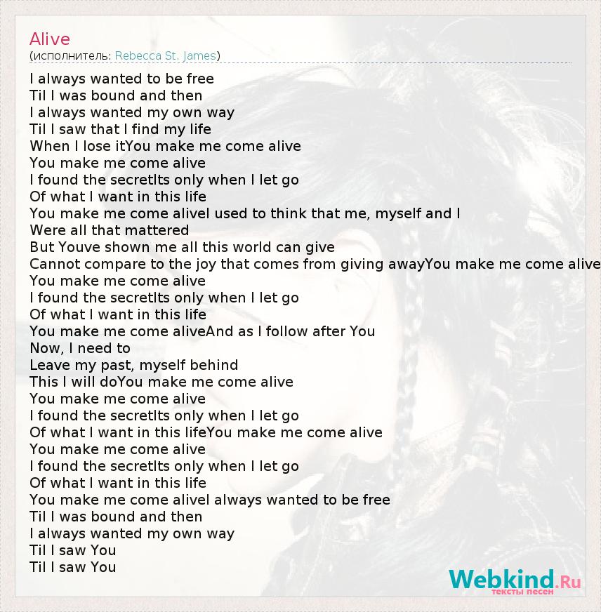 I always wanted to be free Til I was bound and then I always wanted my own way Til I saw that I find my life When I lose itYou make me come alive You make me come alive I found the secretIts only when I let go Of what I want in this life You make me come aliveI used to think that me, myself and I Were all that mattered But Youve shown me all this world can give Cannot compare to the joy that comes from giving awayYou make me come alive You make me come alive I found the secretIts only when I let go Of what I want in this life You make me come aliveAnd as I follow after You Now, I need to Leave my past, myself behind This I will doYou make me come alive You make me come alive I found the secretIts only when I let go Of what I want in this lifeYou make me come alive You make me come alive I found the secretIts only when I let go Of what I want in this life You make me come aliveI always wanted to be free Til I was bound and then I always wanted my own way Til I saw You Til I saw You