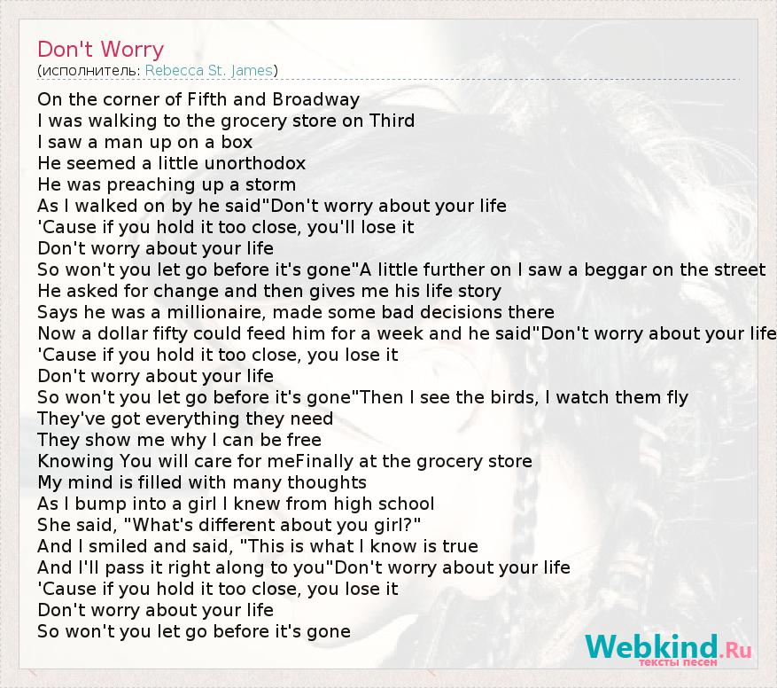 On the corner of Fifth and Broadway I was walking to the grocery store on Third I saw a man up on a box He seemed a little unorthodox He was preaching up a storm As I walked on by he said"Don't worry about your life 'Cause if you hold it too close, you'll lose it Don't worry about your life So won't you let go before it's gone"A little further on I saw a beggar on the street He asked for change and then gives me his life story Says he was a millionaire, made some bad decisions there Now a dollar fifty could feed him for a week and he said"Don't worry about your life 'Cause if you hold it too close, you lose it Don't worry about your life So won't you let go before it's gone"Then I see the birds, I watch them fly They've got everything they need They show me why I can be free Knowing You will care for meFinally at the grocery store My mind is filled with many thoughts As I bump into a girl I knew from high school She said, "What's different about you girl?" And I smiled and said, "This is what I know is true And I'll pass it right along to you"Don't worry about your life 'Cause if you hold it too close, you lose it Don't worry about your life So won't you let go before it's gone