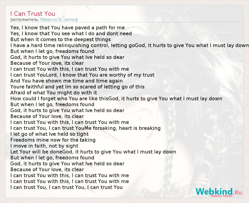 Yes, I know that You have paved a path for me Yes, I know that You see what I do and dont need But when it comes to the deepest things I have a hard time relinquishing control, letting goGod, it hurts to give You what I must lay down But when I let go, freedoms found God, it hurts to give You what Ive held so dear Because of Your love, its clear I can trust You with this, I can trust You with me I can trust YouLord, I know that You are worthy of my trust And You have shown me time and time again Youre faithful and yet Im so scared of letting go of this Afraid of what You might do with it How could I forget who You are like thisGod, it hurts to give You what I must lay down But when I let go, freedoms found God, it hurts to give You what Ive held so dear Because of Your love, its clear I can trust You with this, I can trust You with me I can trust You, I can trust YouMe forsaking, heart is breaking I let go of what Ive held so tight Freedoms mine now for the taking I move in faith, not by sight Let Your will be doneGod, it hurts to give You what I must lay down But when I let go, freedoms found God, it hurts to give You what Ive held so dear Because of Your love, its clear I can trust You with this, I can trust You with me I can trust You with this, I can trust You with me I can trust You, I can trust You, I can trust You