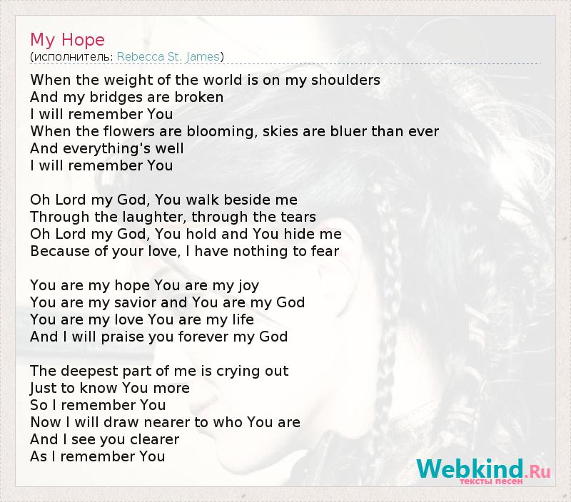 When the weight of the world is on my shoulders And my bridges are broken I will remember You When the flowers are blooming, skies are bluer than ever And everything's well I will remember You Oh Lord my God, You walk beside me Through the laughter, through the tears Oh Lord my God, You hold and You hide me Because of your love, I have nothing to fear You are my hope You are my joy You are my savior and You are my God You are my love You are my life And I will praise you forever my God The deepest part of me is crying out Just to know You more So I remember You Now I will draw nearer to who You are And I see you clearer As I remember You