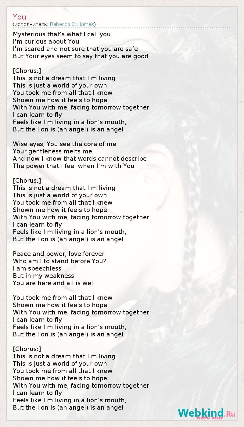 Таинственность - так я называю тебя… Мне любопытно все, что связано с тобой. Мне страшно и я не уверена что в безопасности, когда ты рядом. Но твои глаза говорят мне об обратном. [Припев:] Мою жизнь нельзя назвать мечтой, Ведь это лишь твой собственный мир. Ты забрал меня от всего мне знакомого, Ты показал, каково это - надеяться. С тобой вместе мы встретим «завтра», И я смогу научиться летать. Такое чувство, что я живу в пасти Льва… Но этот Лев - Ангел… Мудрые глаза… ты видишь меня ими изнутри. Я тяю от твоей мягкости... Сейчас я знаю, что словами нельзя описать силу, Которую я в себе ощущаю, когда я рядом с тобой… [Припев:] Мою жизнь нельзя назвать мечтой, Ведь это лишь твой собственный мир. Ты забрал меня от всего мне знакомого, Ты показал, каково это - надеяться. С тобой вместе мы встретим «завтра», И я смогу научиться летать. Такое чувство, что я живу в пасти Льва… Но этот Лев - Ангел… Мир и власть, любовь навеки. Кто я рядом с тобой? Я безмолвна. Но даже если я слаба, А ты здесь, то все становится хорошо. Ты забрал меня от всего мне знакомого, Ты показал, каково это - надеяться. С тобой вместе мы встретим «завтра», И я смогу научиться летать. Такое чувство, что я живу в пасти Льва… Но этот Лев - Ангел… [Припев:] Мою жизнь нельзя назвать мечтой, Ведь это лишь твой собственный мир. Ты забрал меня от всего мне знакомого, Ты показал, каково это - надеяться. С тобой вместе мы встретим «завтра», И я смогу научиться летать. Такое чувство, что я живу в пасти Льва… Но этот Лев - Ангел…