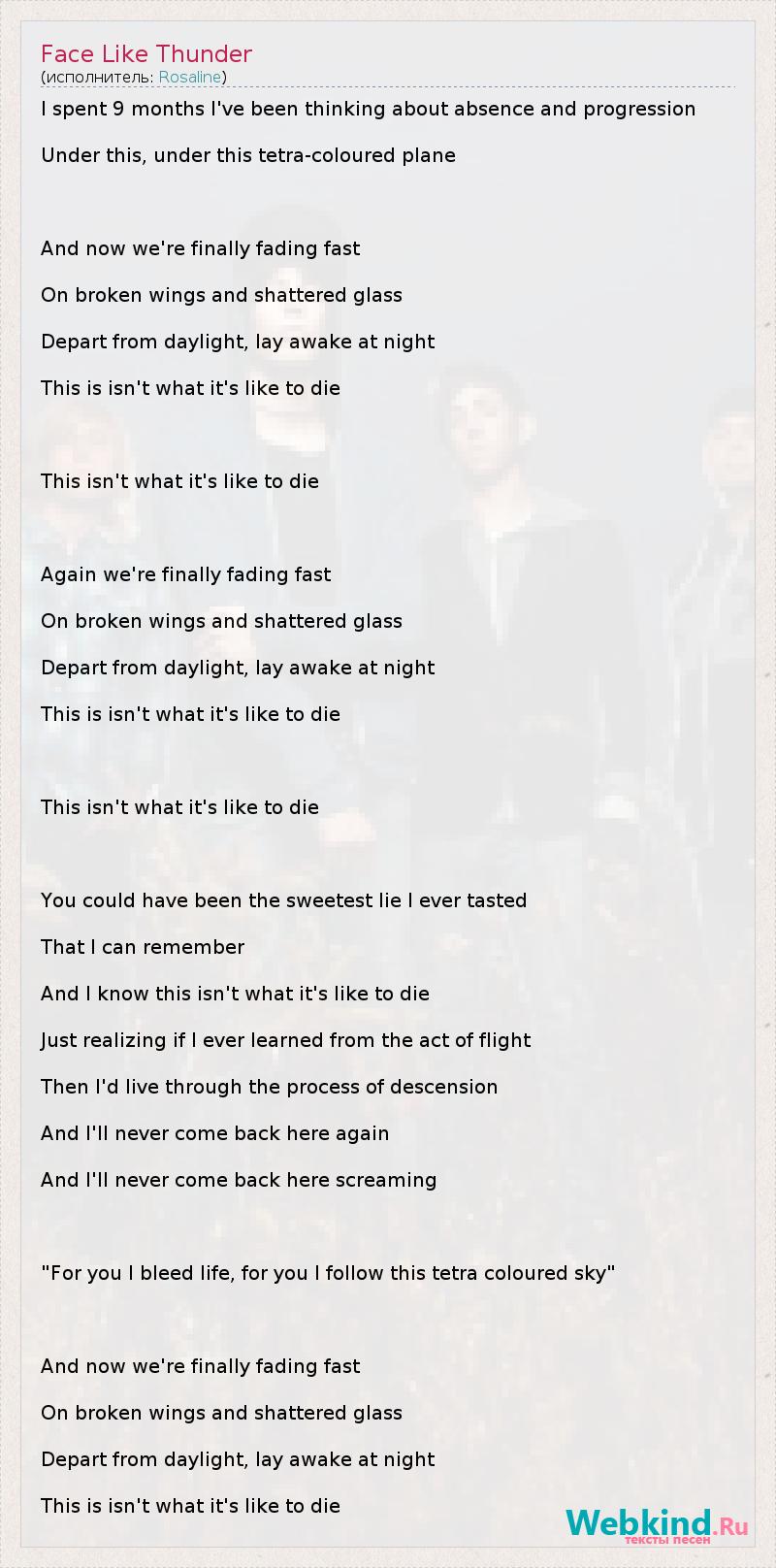 I spent 9 months I've been thinking about absence and progression Under this, under this tetra-coloured plane And now we're finally fading fast On broken wings and shattered glass Depart from daylight, lay awake at night This is isn't what it's like to die This isn't what it's like to die Again we're finally fading fast On broken wings and shattered glass Depart from daylight, lay awake at night This is isn't what it's like to die This isn't what it's like to die You could have been the sweetest lie I ever tasted That I can remember And I know this isn't what it's like to die Just realizing if I ever learned from the act of flight Then I'd live through the process of descension And I'll never come back here again And I'll never come back here screaming "For you I bleed life, for you I follow this tetra coloured sky" And now we're finally fading fast On broken wings and shattered glass Depart from daylight, lay awake at night This is isn't what it's like to die