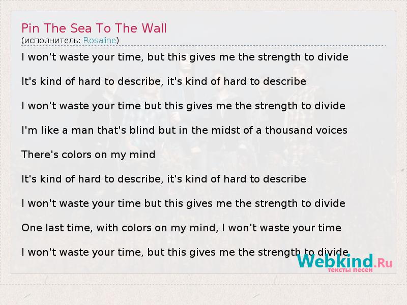 I won't waste your time, but this gives me the strength to divide It's kind of hard to describe, it's kind of hard to describe I won't waste your time but this gives me the strength to divide I'm like a man that's blind but in the midst of a thousand voices There's colors on my mind It's kind of hard to describe, it's kind of hard to describe I won't waste your time but this gives me the strength to divide One last time, with colors on my mind, I won't waste your time I won't waste your time, but this gives me the strength to divide