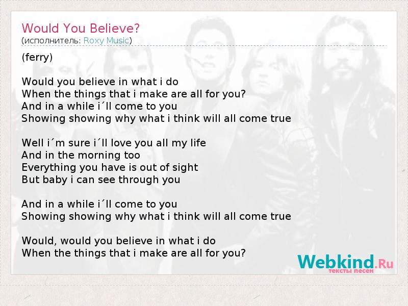 (ferry) Would you believe in what i do When the things that i make are all for you? And in a while i´ll come to you Showing showing why what i think will all come true Well i´m sure i´ll love you all my life And in the morning too Everything you have is out of sight But baby i can see through you And in a while i´ll come to you Showing showing why what i think will all come true Would, would you believe in what i do When the things that i make are all for you?
