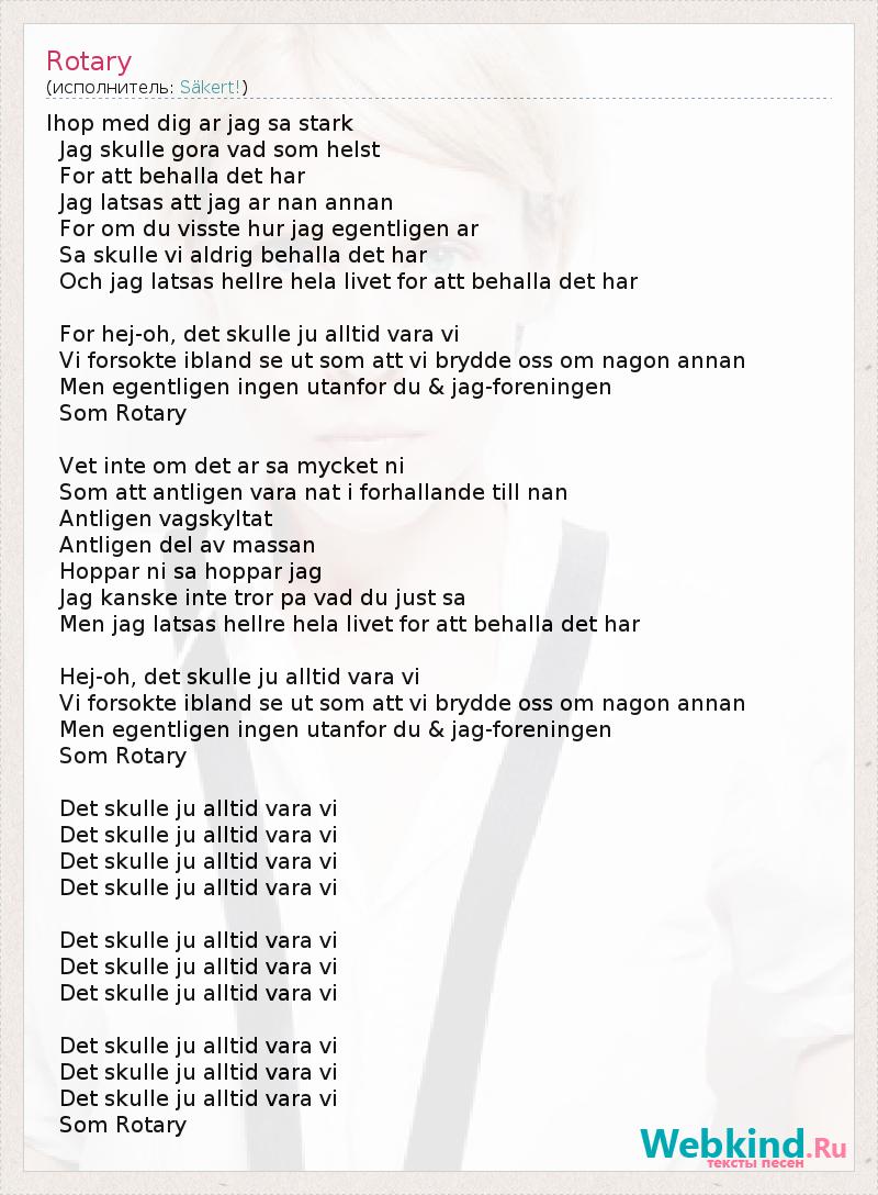 Ihop med dig ar jag sa stark Jag skulle gora vad som helst For att behalla det har Jag latsas att jag ar nan annan For om du visste hur jag egentligen ar Sa skulle vi aldrig behalla det har Och jag latsas hellre hela livet for att behalla det har For hej-oh, det skulle ju alltid vara vi Vi forsokte ibland se ut som att vi brydde oss om nagon annan Men egentligen ingen utanfor du & jag-foreningen Som Rotary Vet inte om det ar sa mycket ni Som att antligen vara nat i forhallande till nan Antligen vagskyltat Antligen del av massan Hoppar ni sa hoppar jag Jag kanske inte tror pa vad du just sa Men jag latsas hellre hela livet for att behalla det har Hej-oh, det skulle ju alltid vara vi Vi forsokte ibland se ut som att vi brydde oss om nagon annan Men egentligen ingen utanfor du & jag-foreningen Som Rotary Det skulle ju alltid vara vi Det skulle ju alltid vara vi Det skulle ju alltid vara vi Det skulle ju alltid vara vi Det skulle ju alltid vara vi Det skulle ju alltid vara vi Det skulle ju alltid vara vi Det skulle ju alltid vara vi Det skulle ju alltid vara vi Det skulle ju alltid vara vi Som Rotary