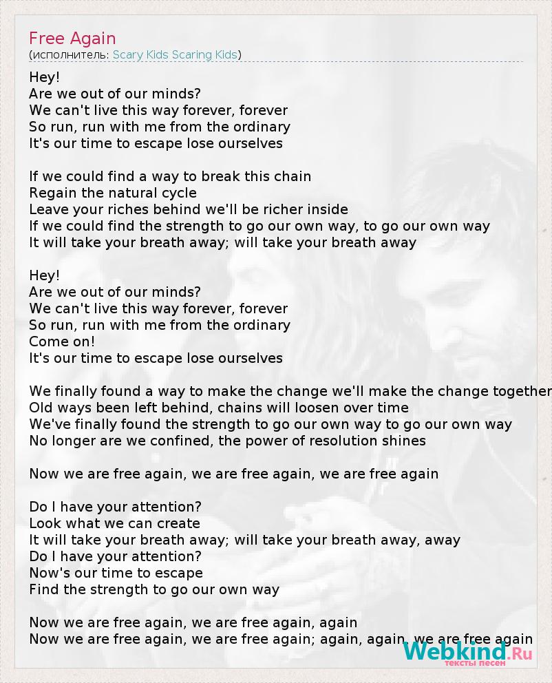 Эй! Мы сошли с ума? Мы не можем жить вот так вечно, вечно. Так беги, беги вместе со мной от обыденности. Настало время сбежать и измениться. Если бы только мы смогли найти способ разрушить эти оковы, Восстановить природный баланс, (Откажись от своих богатств, мы станем богаче духовно) Если бы только мы смогли найти в себе силы пойти свои путем, пойти своим путем, У тебя бы перехватило дыхание, перехватило дыхание. Эй! Мы сошли с ума? Мы не можем жить вот так вечно, вечно. Так беги, беги вместе со мной от обыденности. Давай! Настало время сбежать и измениться. В конце концов, мы нашли способ все изменить, изменить все вместе! (Старые способы забыты, со временем оковы ослабнут) В конце концов, мы нашли в себе силы пойти своим путем, пойти своим путем. Нас больше не ограничивают, мы излучаем решимость! 1 И теперь мы свободны вновь, мы свободны вновь, мы свободны вновь! Слушаешь ли ты меня? Послушай, что мы можем сотворить. У тебя перехватит дыхание, перехватит дыхание. Слушаешь ли ты меня? Настало время сбежать, Найти в себе силы пойти своим путем. Теперь мы свободны вновь, мы свободны вновь, вновь! Теперь мы свободны вновь, мы свободны вновь; вновь, вновь, мы свободны вновь. 1 - дословно: сила нашей решимости сияет
