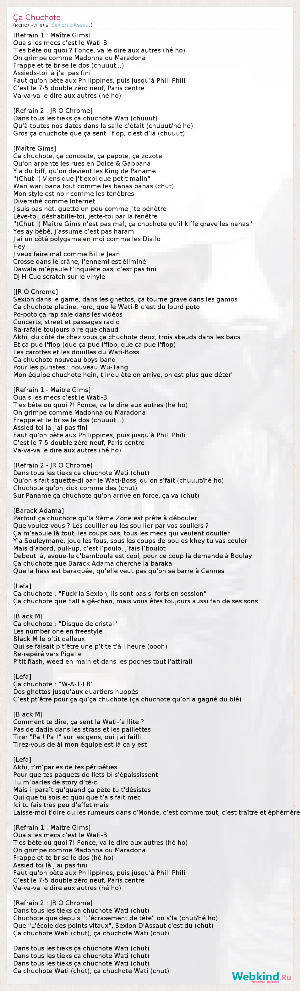 [Refrain 1 : Maître Gims] Ouais les mecs c'est le Wati-B T'es bête ou quoi ? Fonce, va le dire aux autres (hé ho) On grimpe comme Madonna ou Maradona Frappe et te brise le dos (chuuut...) Assieds-toi là j'ai pas fini Faut qu'on pète aux Philippines, puis jusqu'à Phili Phili C'est le 7-5 double zéro neuf, Paris centre Va-va-va le dire aux autres (hé ho) [Refrain 2 : JR O Chrome] Dans tous les tieks ça chuchote Wati (chuuut) Qu'à toutes nos dates dans la salle c'était (chuuut/hé ho) Gros ça chuchote que ça sent l'flop, c'est d'la (chuuut) [Maître Gims] Ça chuchote, ça concocte, ça papote, ça zozote Qu'on arpente les rues en Dolce & Gabbana Y'a du biff, qu'on devient les King de Paname "(Chut !) Viens que j't'explique petit malin" Wari wari bana tout comme les banas banas (chut) Mon style est noir comme les ténèbres Diversifié comme Internet J'suis pas net, guette un peu comme j'te pénètre Lève-toi, déshabille-toi, jette-toi par la fenêtre "(Chut !) Maître Gims n'est pas mal, ça chuchote qu'il kiffe grave les nanas" Yes ay bébé, j'assume c'est pas haram J'ai un côté polygame en moi comme les Diallo Hey J'veux faire mal comme Billie Jean Crosse dans le crâne, l'ennemi est éliminé Dawala m'épaule t'inquiète pas, c'est pas fini DJ H-Cue scratch sur le vinyle [JR O Chrome] Sexion dans le game, dans les ghettos, ça tourne grave dans les gamos Ça chuchote platine, roro, que le Wati-B c'est du lourd poto Po-poto ça rap sale dans les vidéos Concerts, street et passages radio Ra-rafale toujours pire que chaud Akhi, du côté de chez vous ça chuchote deux, trois skeuds dans les bacs Et ça pue l'flop (que ça pue l'flop, que ça pue l'flop) Les carottes et les douilles du Wati-Boss Ça chuchote nouveau boys-band Pour les puristes : nouveau Wu-Tang Mon équipe chuchote hein, t'inquiète on arrive, on est plus que déter' [Refrain 1 - Maître Gims] Ouais les mecs c'est le Wati-B T'es bête ou quoi ?! Fonce, va le dire aux autres (hé ho) On grimpe comme Madonna ou Maradona Frappe et te brise le dos (chuuut...) Assied toi là j'ai pas fini Faut qu'on pète aux Philippines, puis jusqu'à Phili Phili C'est le 7-5 double zéro neuf, Paris centre Va-va-va le dire aux autres (hé ho) [Refrain 2 - JR O Chrome] Dans tous les tieks ça chuchote Wati (chut) Qu'on s'fait squette-di par le Wati-Boss, qu'on s'fait (chuuut/hé ho) Chuchote qu'on kick comme des (chut) Sur Paname ça chuchote qu'on arrive en force, ça va (chut) [Barack Adama] Partout ça chuchote qu'la 9ème Zone est prête à débouler Que voulez-vous ? Les couiller ou les souiller par vos souliers ? Ça m'saoule là tout, les coups bas, tous les mecs qui veulent douiller Y'a Souleymane, joue les fous, sous les coups de boules khey tu vas couler Mais d'abord, pull-up, c'est l'poulo, j'fais l'boulot Debout là, avoue-le c'bamboula est cool, pour ce coup là demande à Boulay Ça chuchote que Barack Adama cherche la baraka Que la hass est baraquée, qu'elle veut pas qu'on se barre à Cannes [Lefa] Ça chuchote : "Fuck la Sexion, ils sont pas si forts en session" Ça chuchote que Fall a gé-chan, mais vous êtes toujours aussi fan de ses sons [Black M] Ça chuchote : "Disque de cristal" Les number one en freestyle Black M le p'tit dalleux Qui se faisait p't'être une p'tite t'à l'heure (oooh) Re-repéré vers Pigalle P'tit flash, weed en main et dans les poches tout l'attirail [Lefa] Ça chuchote : "W-A-T-I B" Des ghettos jusqu'aux quartiers huppés C'est pt'être pour ça qu'ça chuchote (ça chuchote qu'on a gagné du blé) [Black M] Comment te dire, ça sent la Wati-faillite ? Pas de dadia dans les strass et les paillettes Tirer "Pa ! Pa !" sur les gens, oui j'ai failli Tirez-vous de àl mon équipe est là ça y est [Lefa] Akhi, t'm'parles de tes péripéties Pour que tes paquets de llets-bi s'épaississent Tu m'parles de story d'té-ci Mais il paraît qu'quand ça pète tu t'désistes Qui que tu sois et quoi que t'ais fait mec Ici tu fais très peu d'effet mais Laisse-moi t'dire qu'les rumeurs dans c'Monde, c'est comme tout, c'est traître et éphémère [Refrain 1 : Maître Gims] Ouais les mecs c'est le Wati-B T'es bête ou quoi ?! Fonce, va le dire aux autres (hé ho) On grimpe comme Madonna ou Maradona Frappe et te brise le dos (hé ho) Assied toi là j'ai pas fini Faut qu'on pète aux Philippines, puis jusqu'à Phili Phili C'est le 7-5 double zéro neuf, Paris centre Va-va-va le dire aux autres (hé ho) [Refrain 2 : JR O Chrome] Dans tous les tieks ça chuchote Wati (chut) Chuchote que depuis "L'écrasement de tête" on s'la (chut/hé ho) Que "L'école des points vitaux", Sexion D'Assaut c'est du (chut) Ça chuchote Wati (chut), ça chuchote Wati (chut) Dans tous les tieks ça chuchote Wati (chut) Dans tous les tieks ça chuchote Wati (chut) Dans tous les tieks ça chuchote Wati (chut) Ça chuchote Wati (chut), ça chuchote Wati (chut)