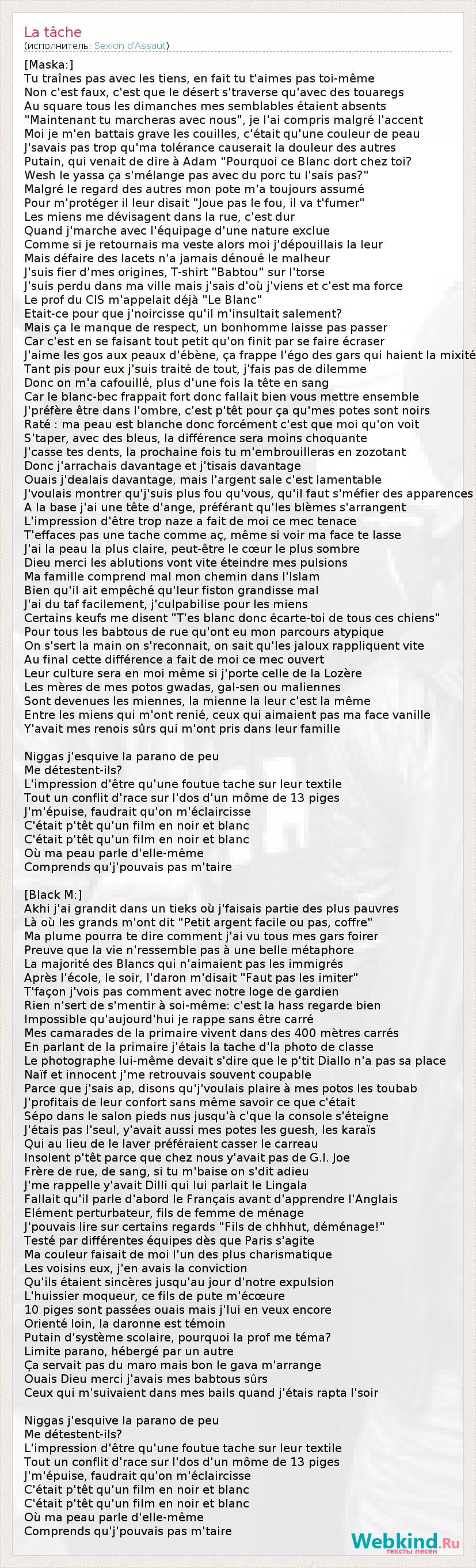 [Maska:] Tu traînes pas avec les tiens, en fait tu t'aimes pas toi-même Non c'est faux, c'est que le désert s'traverse qu'avec des touaregs Au square tous les dimanches mes semblables étaient absents "Maintenant tu marcheras avec nous", je l'ai compris malgré l'accent Moi je m'en battais grave les couilles, c'était qu'une couleur de peau J'savais pas trop qu'ma tolérance causerait la douleur des autres Putain, qui venait de dire à Adam "Pourquoi ce Blanc dort chez toi? Wesh le yassa ça s'mélange pas avec du porc tu l'sais pas?" Malgré le regard des autres mon pote m'a toujours assumé Pour m'protéger il leur disait "Joue pas le fou, il va t'fumer" Les miens me dévisagent dans la rue, c'est dur Quand j'marche avec l'équipage d'une nature exclue Comme si je retournais ma veste alors moi j'dépouillais la leur Mais défaire des lacets n'a jamais dénoué le malheur J'suis fier d'mes origines, T-shirt "Babtou" sur l'torse J'suis perdu dans ma ville mais j'sais d'où j'viens et c'est ma force Le prof du CIS m'appelait déjà "Le Blanc" Etait-ce pour que j'noircisse qu'il m'insultait salement? Mais ça le manque de respect, un bonhomme laisse pas passer Car c'est en se faisant tout petit qu'on finit par se faire écraser J'aime les gos aux peaux d'ébène, ça frappe l'égo des gars qui haient la mixité Tant pis pour eux j'suis traité de tout, j'fais pas de dilemme Donc on m'a cafouillé, plus d'une fois la tête en sang Car le blanc-bec frappait fort donc fallait bien vous mettre ensemble J'préfère être dans l'ombre, c'est p'têt pour ça qu'mes potes sont noirs Raté : ma peau est blanche donc forcément c'est que moi qu'on voit S'taper, avec des bleus, la différence sera moins choquante J'casse tes dents, la prochaine fois tu m'embrouilleras en zozotant Donc j'arrachais davantage et j'tisais davantage Ouais j'dealais davantage, mais l'argent sale c'est lamentable J'voulais montrer qu'j'suis plus fou qu'vous, qu'il faut s'méfier des apparences A la base j'ai une tête d'ange, préférant qu'les blèmes s'arrangent L'impression d'être trop naze a fait de moi ce mec tenace T'effaces pas une tache comme aç, même si voir ma face te lasse J'ai la peau la plus claire, peut-être le cœur le plus sombre Dieu merci les ablutions vont vite éteindre mes pulsions Ma famille comprend mal mon chemin dans l'Islam Bien qu'il ait empêché qu'leur fiston grandisse mal J'ai du taf facilement, j'culpabilise pour les miens Certains keufs me disent "T'es blanc donc écarte-toi de tous ces chiens" Pour tous les babtous de rue qu'ont eu mon parcours atypique On s'sert la main on s'reconnait, on sait qu'les jaloux rappliquent vite Au final cette différence a fait de moi ce mec ouvert Leur culture sera en moi même si j'porte celle de la Lozère Les mères de mes potos gwadas, gal-sen ou maliennes Sont devenues les miennes, la mienne la leur c'est la même Entre les miens qui m'ont renié, ceux qui aimaient pas ma face vanille Y'avait mes renois sûrs qui m'ont pris dans leur famille Niggas j'esquive la parano de peu Me détestent-ils? L'impression d'être qu'une foutue tache sur leur textile Tout un conflit d'race sur l'dos d'un môme de 13 piges J'm'épuise, faudrait qu'on m'éclaircisse C'était p'têt qu'un film en noir et blanc C'était p'têt qu'un film en noir et blanc Où ma peau parle d'elle-même Comprends qu'j'pouvais pas m'taire [Black M:] Akhi j'ai grandit dans un tieks où j'faisais partie des plus pauvres Là où les grands m'ont dit "Petit argent facile ou pas, coffre" Ma plume pourra te dire comment j'ai vu tous mes gars foirer Preuve que la vie n'ressemble pas à une belle métaphore La majorité des Blancs qui n'aimaient pas les immigrés Après l'école, le soir, l'daron m'disait "Faut pas les imiter" T'façon j'vois pas comment avec notre loge de gardien Rien n'sert de s'mentir à soi-même: c'est la hass regarde bien Impossible qu'aujourd'hui je rappe sans être carré Mes camarades de la primaire vivent dans des 400 mètres carrés En parlant de la primaire j'étais la tache d'la photo de classe Le photographe lui-même devait s'dire que le p'tit Diallo n'a pas sa place Naïf et innocent j'me retrouvais souvent coupable Parce que j'sais ap, disons qu'j'voulais plaire à mes potos les toubab J'profitais de leur confort sans même savoir ce que c'était Sépo dans le salon pieds nus jusqu'à c'que la console s'éteigne J'étais pas l'seul, y'avait aussi mes potes les guesh, les karaïs Qui au lieu de le laver préféraient casser le carreau Insolent p'têt parce que chez nous y'avait pas de G.I. Joe Frère de rue, de sang, si tu m'baise on s'dit adieu J'me rappelle y'avait Dilli qui lui parlait le Lingala Fallait qu'il parle d'abord le Français avant d'apprendre l'Anglais Elément perturbateur, fils de femme de ménage J'pouvais lire sur certains regards "Fils de chhhut, déménage!" Testé par différentes équipes dès que Paris s'agite Ma couleur faisait de moi l'un des plus charismatique Les voisins eux, j'en avais la conviction Qu'ils étaient sincères jusqu'au jour d'notre expulsion L'huissier moqueur, ce fils de pute m'écœure 10 piges sont passées ouais mais j'lui en veux encore Orienté loin, la daronne est témoin Putain d'système scolaire, pourquoi la prof me téma? Limite parano, hébergé par un autre Ça servait pas du maro mais bon le gava m'arrange Ouais Dieu merci j'avais mes babtous sûrs Ceux qui m'suivaient dans mes bails quand j'étais rapta l'soir Niggas j'esquive la parano de peu Me détestent-ils? L'impression d'être qu'une foutue tache sur leur textile Tout un conflit d'race sur l'dos d'un môme de 13 piges J'm'épuise, faudrait qu'on m'éclaircisse C'était p'têt qu'un film en noir et blanc C'était p'têt qu'un film en noir et blanc Où ma peau parle d'elle-même Comprends qu'j'pouvais pas m'taire