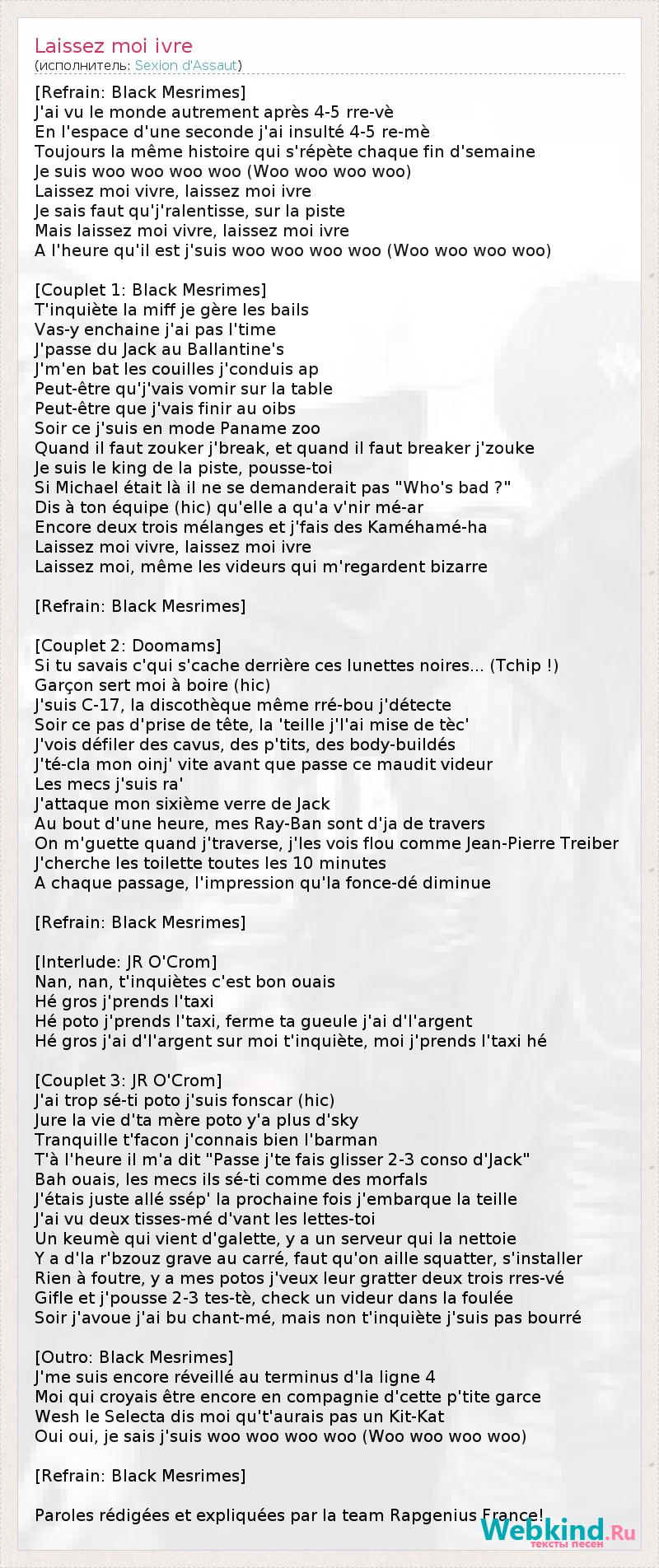 [Refrain: Black Mesrimes] J'ai vu le monde autrement après 4-5 rre-vè En l'espace d'une seconde j'ai insulté 4-5 re-mè Toujours la même histoire qui s'répète chaque fin d'semaine Je suis woo woo woo woo (Woo woo woo woo) Laissez moi vivre, laissez moi ivre Je sais faut qu'j'ralentisse, sur la piste Mais laissez moi vivre, laissez moi ivre A l'heure qu'il est j'suis woo woo woo woo (Woo woo woo woo) [Couplet 1: Black Mesrimes] T'inquiète la miff je gère les bails Vas-y enchaine j'ai pas l'time J'passe du Jack au Ballantine's J'm'en bat les couilles j'conduis ap Peut-être qu'j'vais vomir sur la table Peut-être que j'vais finir au oibs Soir ce j'suis en mode Paname zoo Quand il faut zouker j'break, et quand il faut breaker j'zouke Je suis le king de la piste, pousse-toi Si Michael était là il ne se demanderait pas "Who's bad ?" Dis à ton équipe (hic) qu'elle a qu'a v'nir mé-ar Encore deux trois mélanges et j'fais des Kaméhamé-ha Laissez moi vivre, laissez moi ivre Laissez moi, même les videurs qui m'regardent bizarre [Refrain: Black Mesrimes] [Couplet 2: Doomams] Si tu savais c'qui s'cache derrière ces lunettes noires... (Tchip !) Garçon sert moi à boire (hic) J'suis C-17, la discothèque même rré-bou j'détecte Soir ce pas d'prise de tête, la 'teille j'l'ai mise de tèc' J'vois défiler des cavus, des p'tits, des body-buildés J'té-cla mon oinj' vite avant que passe ce maudit videur Les mecs j'suis ra' J'attaque mon sixième verre de Jack Au bout d'une heure, mes Ray-Ban sont d'ja de travers On m'guette quand j'traverse, j'les vois flou comme Jean-Pierre Treiber J'cherche les toilette toutes les 10 minutes A chaque passage, l'impression qu'la fonce-dé diminue [Refrain: Black Mesrimes] [Interlude: JR O'Crom] Nan, nan, t'inquiètes c'est bon ouais Hé gros j'prends l'taxi Hé poto j'prends l'taxi, ferme ta gueule j'ai d'l'argent Hé gros j'ai d'l'argent sur moi t'inquiète, moi j'prends l'taxi hé [Couplet 3: JR O'Crom] J'ai trop sé-ti poto j'suis fonscar (hic) Jure la vie d'ta mère poto y'a plus d'sky Tranquille t'facon j'connais bien l'barman T'à l'heure il m'a dit "Passe j'te fais glisser 2-3 conso d'Jack" Bah ouais, les mecs ils sé-ti comme des morfals J'étais juste allé ssép' la prochaine fois j'embarque la teille J'ai vu deux tisses-mé d'vant les lettes-toi Un keumè qui vient d'galette, y a un serveur qui la nettoie Y a d'la r'bzouz grave au carré, faut qu'on aille squatter, s'installer Rien à foutre, y a mes potos j'veux leur gratter deux trois rres-vé Gifle et j'pousse 2-3 tes-tè, check un videur dans la foulée Soir j'avoue j'ai bu chant-mé, mais non t'inquiète j'suis pas bourré [Outro: Black Mesrimes] J'me suis encore réveillé au terminus d'la ligne 4 Moi qui croyais être encore en compagnie d'cette p'tite garce Wesh le Selecta dis moi qu't'aurais pas un Kit-Kat Oui oui, je sais j'suis woo woo woo woo (Woo woo woo woo) [Refrain: Black Mesrimes] Paroles rédigées et expliquées par la team Rapgenius France!