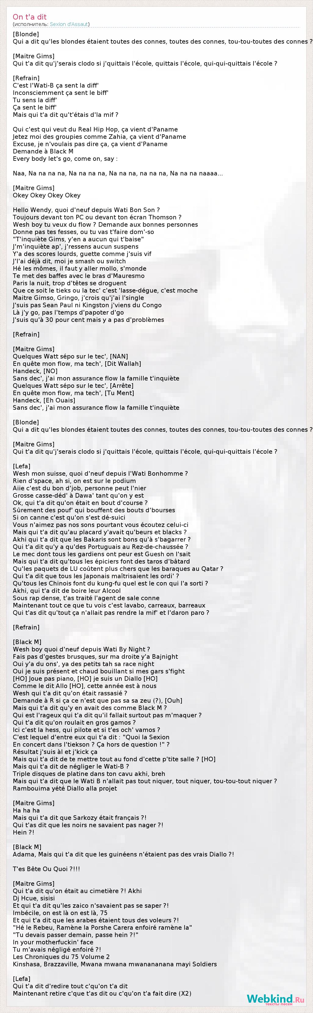 [Blonde] Qui a dit qu'les blondes étaient toutes des connes, toutes des connes, tou-tou-toutes des connes ? [Maitre Gims] Qui t'a dit qu'j'serais clodo si j'quittais l'école, quittais l'école, qui-qui-quittais l'école ? [Refrain] C'est l'Wati-B ça sent la diff' Inconsciemment ça sent le biff' Tu sens la diff' Ça sent le biff' Mais qui t'a dit qu't'étais d'la mif ? Qui c'est qui veut du Real Hip Hop, ça vient d'Paname Jetez moi des groupies comme Zahia, ça vient d'Paname Excuse, je n'voulais pas dire ça, ça vient d'Paname Demande à Black M Every body let's go, come on, say : Naa, Na na na na, Na na na na, Na na na, na na na, Na na na naaaa... [Maitre Gims] Okey Okey Okey Okey Hello Wendy, quoi d'neuf depuis Wati Bon Son ? Toujours devant ton PC ou devant ton écran Thomson ? Wesh boy tu veux du flow ? Demande aux bonnes personnes Donne pas tes fesses, ou tu vas t'faire dom'-so "T'inquiète Gims, y'en a aucun qui t'baise" J'm'inquiète ap', j'ressens aucun suspens Y'a des scores lourds, guette comme j'suis vif J'l'ai déjà dit, moi je smash ou switch Hé les mômes, il faut y aller mollo, s'monde Te met des baffes avec le bras d'Mauresmo Paris la nuit, trop d'têtes se droguent Que ce soit le tieks ou la tec' c'est 'lasse-dégue, c'est moche Maitre Gimso, Gringo, j'crois qu'j'ai l'single J'suis pas Sean Paul ni Kingston j'viens du Congo Là j'y go, pas l'temps d'papoter d'go J'suis qu'à 30 pour cent mais y a pas d'problèmes [Refrain] [Maitre Gims] Quelques Watt sépo sur le tec', [NAN] En quête mon flow, ma tech', [Dit Wallah] Handeck, [NO] Sans dec', j'ai mon assurance flow la famille t'inquiète Quelques Watt sépo sur le tec', [Arrête] En quête mon flow, ma tech', [Tu Ment] Handeck, [Eh Ouais] Sans dec', j'ai mon assurance flow la famille t'inquiète [Blonde] Qui a dit qu'les blondes étaient toutes des connes, toutes des connes, tou-tou-toutes des connes ? [Maitre Gims] Qui t'a dit qu'j'serais clodo si j'quittais l'école, quittais l'école, qui-qui-quittais l'école ? [Lefa] Wesh mon suisse, quoi d'neuf depuis l'Wati Bonhomme ? Rien d'space, ah si, on est sur le podium Aiie c'est du bon d'job, personne peut l'nier Grosse casse-déd' à Dawa' tant qu'on y est Ok, qui t'a dit qu'on était en bout d'course ? Sûrement des pouf' qui bouffent des bouts d'bourses Si on canne c'est qu'on s'est dé-suici Vous n'aimez pas nos sons pourtant vous écoutez celui-ci Mais qui t'a dit qu'au placard y'avait qu'beurs et blacks ? Akhi qui t'a dit que les Bakaris sont bons qu'à s'bagarrer ? Qui t'a dit qu'y a qu'des Portuguais au Rez-de-chaussée ? Le mec dont tous les gardiens ont peur est Guesh on l'sait Mais qui t'a dit qu'tous les épiciers font des taros d'bâtard Qu'les paquets de LU coûtent plus chers que les baraques au Qatar ? Qui t'a dit que tous les Japonais maîtrisaient les ordi' ? Qu'tous les Chinois font du kung-fu quel est le con qui l'a sorti ? Akhi, qui t'a dit de boire leur Alcool Sous rap dense, t'as traité l'agent de sale conne Maintenant tout ce que tu vois c'est lavabo, carreaux, barreaux Qui t'as dit qu'tout ça n'allait pas rendre la mif' et l'daron paro ? [Refrain] [Black M] Wesh boy quoi d'neuf depuis Wati By Night ? Fais pas d'gestes brusques, sur ma droite y'a Bajnight Oui y'a du ons', ya des petits tah sa race night Oui je suis présent et chaud bouillant si mes gars s'fight [HO] Joue pas piano, [HO] je suis un Diallo [HO] Comme le dit Allo [HO], cette année est à nous Wesh qui t'a dit qu'on était rassasié ? Demande à R si ça ce n'est que pas sa sa zeu (?), [Ouh] Mais qui t'a dit qu'y en avait des comme Black M ? Qui est l'rageux qui t'a dit qu'il fallait surtout pas m'maquer ? Qui t'a dit qu'on roulait en gros gamos ? Ici c'est la hess, qui pilote et si t'es och' vamos ? C'est lequel d'entre eux qui t'a dit : "Quoi la Sexion En concert dans l'tiekson ? Ça hors de question !" ? Résultat j'suis àl et j'kick ça Mais qui t'a dit de te mettre tout au fond d'cette p'tite salle ? [HO] Mais qui t'a dit de négliger le Wati-B ? Triple disques de platine dans ton cavu akhi, breh Mais qui t'a dit que le Wati B n'allait pas tout niquer, tout niquer, tou-tou-tout niquer ? Rambouima yété Diallo alla projet [Maitre Gims] Ha ha ha Mais qui t'a dit que Sarkozy était français ?! Qui t'as dit que les noirs ne savaient pas nager ?! Hein ?! [Black M] Adama, Mais qui t'a dit que les guinéens n'étaient pas des vrais Diallo ?! T'es Bête Ou Quoi ?!!! [Maitre Gims] Qui t'a dit qu'on était au cimetière ?! Akhi Dj Hcue, sisisi Et qui t'a dit qu'les zaico n'savaient pas se saper ?! Imbécile, on est là on est là, 75 Et qui t'a dit que les arabes étaient tous des voleurs ?! "Hé le Rebeu, Ramène la Porshe Carera enfoiré ramène la" "Tu devais passer demain, passe hein ?!" In your motherfuckin' face Tu m'avais négligé enfoiré ?! Les Chroniques du 75 Volume 2 Kinshasa, Brazzaville, Mwana mwana mwanananana mayi Soldiers [Lefa] Qui t'a dit d'redire tout c'qu'on t'a dit Maintenant retire c'que t'as dit ou c'qu'on t'a fait dire (X2)