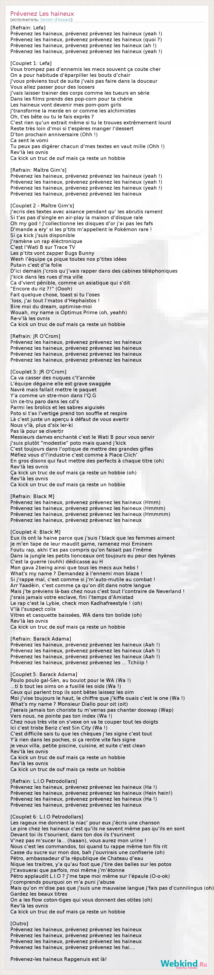 [Refrain: Lefa] Prévenez les haineux, prévenez prévenez les haineux (yeah !) Prévenez les haineux, prévenez prévenez les haineux (quoi ?) Prévenez les haineux, prévenez prévenez les haineux (ah !) Prévenez les haineux, prévenez prévenez les haineux (yeah !) [Couplet 1: Lefa] Vous trompez pas d'ennemis les mecs souvent ça coute cher On a pour habitude d'éparpiller les bouts d'chair J'vous préviens tout de suite j'vais pas faire dans la douceur Vous allez passer pour des loosers J'vais laisser trainer des corps comme les tueurs en série Dans les films prends des pop-corn pour ta chérie Les haineux vont devenir mes pom-pom girls J'transforme la merde en or comme les alchimistes Oh, t'es bête ou tu le fais exprès ? C'est rien qu'un extrait même si tu le trouves extrêmement lourd Reste très loin d'moi si t'espères manger l'dessert D'ton prochain anniversaire (Ohh !) Ca sent le vomi Tu peux pas digérer chacun d'mes textes en vaut mille (Ohh !) Rev'là les ovnis Ca kick un truc de ouf mais ça reste un hobbie [Refrain: Maître Gim's] Prévenez les haineux, prévenez prévenez les haineux (yeah !) Prévenez les haineux, prévenez prévenez les haineux (yeah !) Prévenez les haineux, prévenez prévenez les haineux (yeah !) Prévenez les haineux, prévenez prévenez les haineux [Couplet 2 - Maître Gim's] J'ecris des textes avec aisance pendant qu' les abrutis rament Si t'as pas d'single en air-play la maison d'disque rale Oh my god ! J'collectionne les disques d'or j'ai pas les fafs D'mande a ery' si les p'tits m'appellent le Pokémon rare ! Si ça kick j'suis disponible J'ramène un rap éléctronique C'est l'Wati B sur Trace TV Les p'tits vont zapper Bugs Bunny Wesh l'équipe ça pique toutes nos p'tites idées Putain c'est d'la folie D'ici demain j'crois qu'j'vais rapper dans des cabines téléphoniques J'kick dans les rues d'ma ville Ca d'vient pénible, comme un asiatique qui s'dit "Encore du riz ?!" (Oooh) Fait quelque chose, toast si tu l'oses 'loss, j'ai tout l'matos d'Hephaïstos ! Bire moi du dream, optimise-moi Wouah, my name is Optimus Prime (oh, yeahh) Re-v'là les ovnis Ca kick un truc de ouf mais ça reste un hobbie [Refrain: JR O'Crom] Prévenez les haineux, prévenez prévenez les haineux Prévenez les haineux, prévenez prévenez les haineux Prévenez les haineux, prévenez prévenez les haineux Prévenez les haineux, prévenez prévenez les haineux [Couplet 3: JR O'Crom] Ca va casser des nuques c't'année L'équipe dégaine elle est grave swaggée Navré mais fallait mettre le paquet Y'a comme un stre-mon dans l'Q.G Un ce-tru paro dans les cd's Parmi les brolics et les sabres aiguisés Poto si t'as l'vertige prend ton souffle et respire Là c'est juste un aperçu à défaut de vous avertir Nous v'là, plus d'six ler-ki Pas là pour se divertir Messieurs dames enchanté c'est le Wati B pour vous servir J'suis plutôt "modestie" poto mais quand j'kick C'est toujours dans l'optique de mettre des grandes gifles Méfiez vous d'l'industrie c'est comme à Place Clich' En gros disons qui faut mettre des perfects à chaque titre (oh) Rev'là les ovnis Ça kick un truc de ouf mais ça reste un hobbie (oh) Rev'là les ovnis Ca kick un truc de ouf mais ça reste un hobbie [Refrain: Black M] Prévenez les haineux, prévenez prévenez les haineux (Hmm) Prévenez les haineux, prévenez prévenez les haineux (Hmmm) Prévenez les haineux, prévenez prévenez les haineux (Hmmmm) Prévenez les haineux, prévenez prévenez les haineux [Couplet 4: Black M] Eux ils ont la haine parce que j'suis l'black que les femmes aiment Je m'en tape de leur maudit game, ramenez moi Eminem Foutu rap, akhi t'as pas compris qu'on faisait pas l'même Dans la jungle les petits lionceaux ont toujours eu peur des hyènes C'est la guerre (ouhh) dédicasse au H Mon gava 2being ainsi que tous les mecs aux hebs ! What's my name ? Demandez à l'ennemi mon blaze ! Si j'rappe mal, c'est comme si j'm'auto-mutile au combat ! Arr Yaadèin, c'est comme ça qu'on dit dans notre langue Mais j'te préviens là-bas chez nous c'est tout l'contraire de Neverland ! J'srais jamais votre esclave, fini l'temps d'Amistad Le rap c'est la Lybie, check mon Kadhafreestyle ! (oh) V'là l'suspect colis Vitres et casquette baissées, WA dans ton bolide (oh) Rev'là les ovnis Ca kick un truc de ouf mais ça reste un hobbie [Refrain: Barack Adama] Prévenez les haineux, prévenez prévenez les haineux (Aah !) Prévenez les haineux, prévenez prévenez les haineux (Aah !) Prévenez les haineux, prévenez prévenez les haineux (Aah !) Prévenez les haineux, prévenez prévenez les ... Tchiiip ! [Couplet 5: Barack Adama] Poulo poulo gal-Sèn, au boulot pour le WA (Wa !) ...ti b tout les oims on a fusillé les oids (Wa !) Ceux qui parlent trop ils sont bêtes laissez les oim Moi j'vise toujours le haut, le chiffre que j'kiffe ouais c'est le one (Wa !) What's my name ? Monsieur Diallo pour oit (oit) J'serais jamais ton choriste tu m'verras pas chanter doowap (Wap) Vers nous, ne pointe pas ton index (Wa !) Chez nous très vite on s'vexe on va te couper tout les doigts Ici c'est triste Beriz c'est Sin City (Wa !) C'est difficile sais tu que les chèques j'les signe c'est tout Y'à rien dans les poches, si ça rentre vite fais signe Je veux villa, petite piscine, cuisine, et suite c'est clean Rev'là les ovnis Ca kick un truc de ouf mais ça reste un hobbie Rev'là les ovnis Ca kick un truc de ouf mais ça reste un hobbie [Refrain: L.I.O Petrodollars] Prévenez les haineux, prévenez prévenez les haineux (Ha !) Prévenez les haineux, prévenez prévenez les haineux (Hein hein!) Prévenez les haineux, prévenez prévenez les haineux (Ha !) Prévenez les haineux, prévenez prévenez les haineux [Couplet 6: L.I.O Petrodollars] Les rageux me donnent la niac' pour eux j'écris une chanson Le pire chez les haineux c'est qu'ils ne savent même pas qu'ils en sont Devant toi ils t'sourient, dans ton dos ils t'surinent V'nez pas m'sucer la..