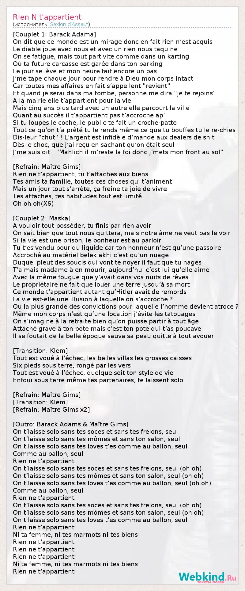 [Couplet 1: Barack Adama] On dit que ce monde est un mirage donc en fait rien n’est acquis Le diable joue avec nous et avec un rien nous taquine On se fatigue, mais tout part vite comme dans un karting Où ta future carcasse est garée dans ton parking Le jour se lève et mon heure fait encore un pas J’me tape chaque jour pour rendre à Dieu mon corps intact Car toutes mes affaires en fait s’appellent "revient" Et quand je serai dans ma tombe, personne me dira "je te rejoins" A la mairie elle t’appartient pour la vie Mais cinq ans plus tard avec un autre elle parcourt la ville Quant au succès il t’appartient pas t’accroche ap' Si tu loupes le coche, le public te fait un croche-patte Tout ce qu’on t’a prêté tu le rends même ce que tu bouffes tu le re-chies Dis-leur "chut" ! L’argent est infidèle d'mande aux dealers de shit Dès le choc, que j’ai reçu en sachant qu’on était seul J’me suis dit : "Mahlich il m’reste la foi donc j’mets mon front au sol" [Refrain: Maître Gims] Rien ne t'appartient, tu t’attaches aux biens Tes amis ta famille, toutes ces choses qui t’animent Mais un jour tout s’arrête, ça freine ta joie de vivre Tes attaches, tes habitudes tout est limité Oh oh oh(X6) [Couplet 2: Maska] A vouloir tout posséder, tu finis par rien avoir On sait bien que tout nous quittera, mais notre âme ne veut pas le voir Si la vie est une prison, le bonheur est au parloir Tu t’es vendu pour du liquide car ton honneur n’est qu’une passoire Accroché au matériel belek akhi c’est qu’un nuage Duquel pleut des soucis qui vont te noyer il faut que tu nages T’aimais madame à en mourir, aujourd’hui c’est lui qu’elle aime Avec la même fougue que y’avait dans vos nuits de rêves Le propriétaire ne fait que louer une terre jusqu’à sa mort Ce monde t’appartient autant qu’Hitler avait de remords La vie est-elle une illusion à laquelle on s’accroche ? Ou la plus grande des convictions pour laquelle l’homme devient atroce ? Même mon corps n’est qu’une location j’évite les tatouages On s’imagine à la retraite bien qu’on puisse partir à tout âge Attaché grave à ton pote mais c’est ton pote qui t’as poucave Il se foutait de la belle époque sauva sa peau quitte à tout avouer [Transition: Klem] Tout est voué à l’échec, les belles villas les grosses caisses Six pieds sous terre, rongé par les vers Tout est voué à l’échec, quelque soit ton style de vie Enfoui sous terre même tes partenaires, te laissent solo [Refrain: Maître Gims] [Transition: Klem] [Refrain: Maître Gims x2] [Outro: Barack Adams & Maître Gims] On t’laisse solo sans tes soces et sans tes frelons, seul On t’laisse solo sans tes mômes et sans ton salon, seul On t'laisse solo sans tes loves t'es comme au ballon, seul Comme au ballon, seul Rien ne t'appartient On t’laisse solo sans tes soces et sans tes frelons, seul (oh oh) On t’laisse solo sans tes mômes et sans ton salon, seul (oh oh) On t'laisse solo sans tes loves t'es comme au ballon, seul (oh oh) Comme au ballon, seul Rien ne t'appartient On t’laisse solo sans tes soces et sans tes frelons, seul (oh oh) On t’laisse solo sans tes mômes et sans ton salon, seul (oh oh) On t'laisse solo sans tes loves t'es comme au ballon, seul Rien ne t'appartient Ni ta femme, ni tes marmots ni tes biens Rien ne t'appartient Rien ne t'appartient Rien ne t'appartient Ni ta femme, ni tes marmots ni tes biens Rien ne t'appartient