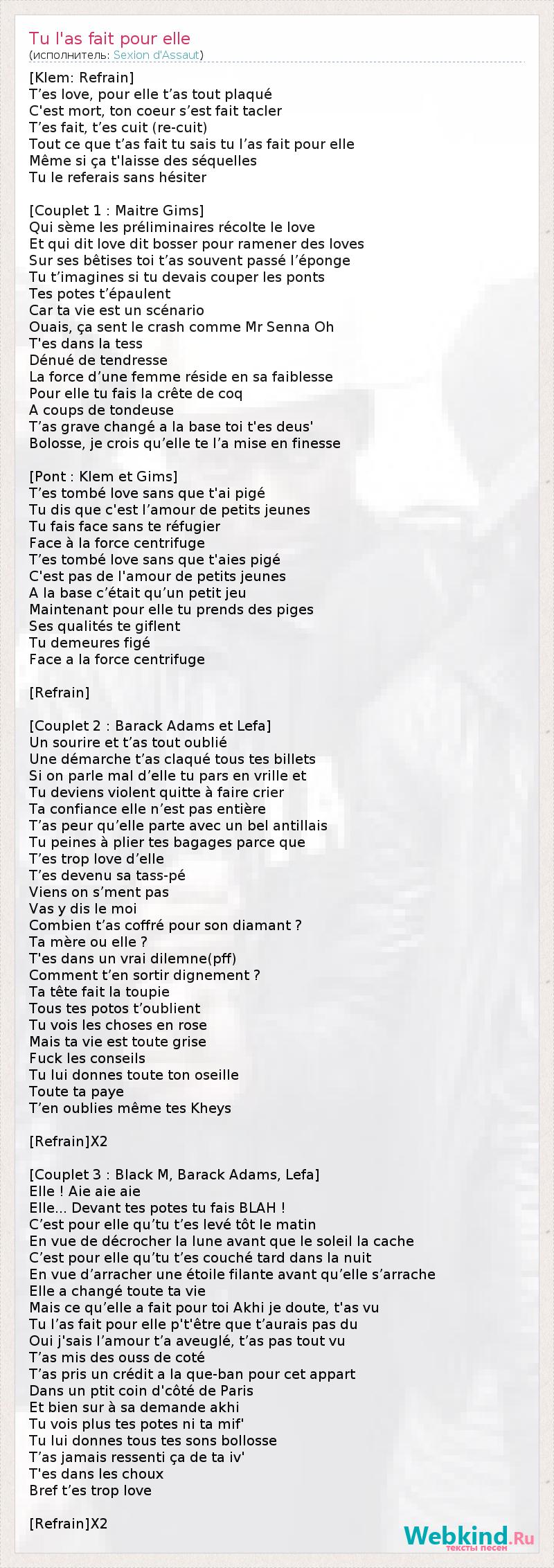 [Klem: Refrain] T’es love, pour elle t’as tout plaqué C'est mort, ton coeur s’est fait tacler T’es fait, t’es cuit (re-cuit) Tout ce que t’as fait tu sais tu l’as fait pour elle Même si ça t'laisse des séquelles Tu le referais sans hésiter [Couplet 1 : Maitre Gims] Qui sème les préliminaires récolte le love Et qui dit love dit bosser pour ramener des loves Sur ses bêtises toi t’as souvent passé l’éponge Tu t’imagines si tu devais couper les ponts Tes potes t’épaulent Car ta vie est un scénario Ouais, ça sent le crash comme Mr Senna Oh T'es dans la tess Dénué de tendresse La force d’une femme réside en sa faiblesse Pour elle tu fais la crête de coq A coups de tondeuse T’as grave changé a la base toi t'es deus' Bolosse, je crois qu’elle te l’a mise en finesse [Pont : Klem et Gims] T’es tombé love sans que t'ai pigé Tu dis que c'est l’amour de petits jeunes Tu fais face sans te réfugier Face à la force centrifuge T’es tombé love sans que t'aies pigé C'est pas de l'amour de petits jeunes A la base c’était qu’un petit jeu Maintenant pour elle tu prends des piges Ses qualités te giflent Tu demeures figé Face a la force centrifuge [Refrain] [Couplet 2 : Barack Adams et Lefa] Un sourire et t’as tout oublié Une démarche t’as claqué tous tes billets Si on parle mal d’elle tu pars en vrille et Tu deviens violent quitte à faire crier Ta confiance elle n’est pas entière T’as peur qu’elle parte avec un bel antillais Tu peines à plier tes bagages parce que T’es trop love d’elle T’es devenu sa tass-pé Viens on s’ment pas Vas y dis le moi Combien t’as coffré pour son diamant ? Ta mère ou elle ? T'es dans un vrai dilemne(pff) Comment t’en sortir dignement ? Ta tête fait la toupie Tous tes potos t’oublient Tu vois les choses en rose Mais ta vie est toute grise Fuck les conseils Tu lui donnes toute ton oseille Toute ta paye T’en oublies même tes Kheys [Refrain]X2 [Couplet 3 : Black M, Barack Adams, Lefa] Elle ! Aie aie aie Elle... Devant tes potes tu fais BLAH ! C’est pour elle qu’tu t’es levé tôt le matin En vue de décrocher la lune avant que le soleil la cache C’est pour elle qu’tu t’es couché tard dans la nuit En vue d’arracher une étoile filante avant qu’elle s’arrache Elle a changé toute ta vie Mais ce qu’elle a fait pour toi Akhi je doute, t'as vu Tu l’as fait pour elle p't'être que t’aurais pas du Oui j'sais l’amour t’a aveuglé, t’as pas tout vu T’as mis des ouss de coté T’as pris un crédit a la que-ban pour cet appart Dans un ptit coin d'côté de Paris Et bien sur à sa demande akhi Tu vois plus tes potes ni ta mif' Tu lui donnes tous tes sons bollosse T’as jamais ressenti ça de ta iv' T'es dans les choux Bref t’es trop love [Refrain]X2