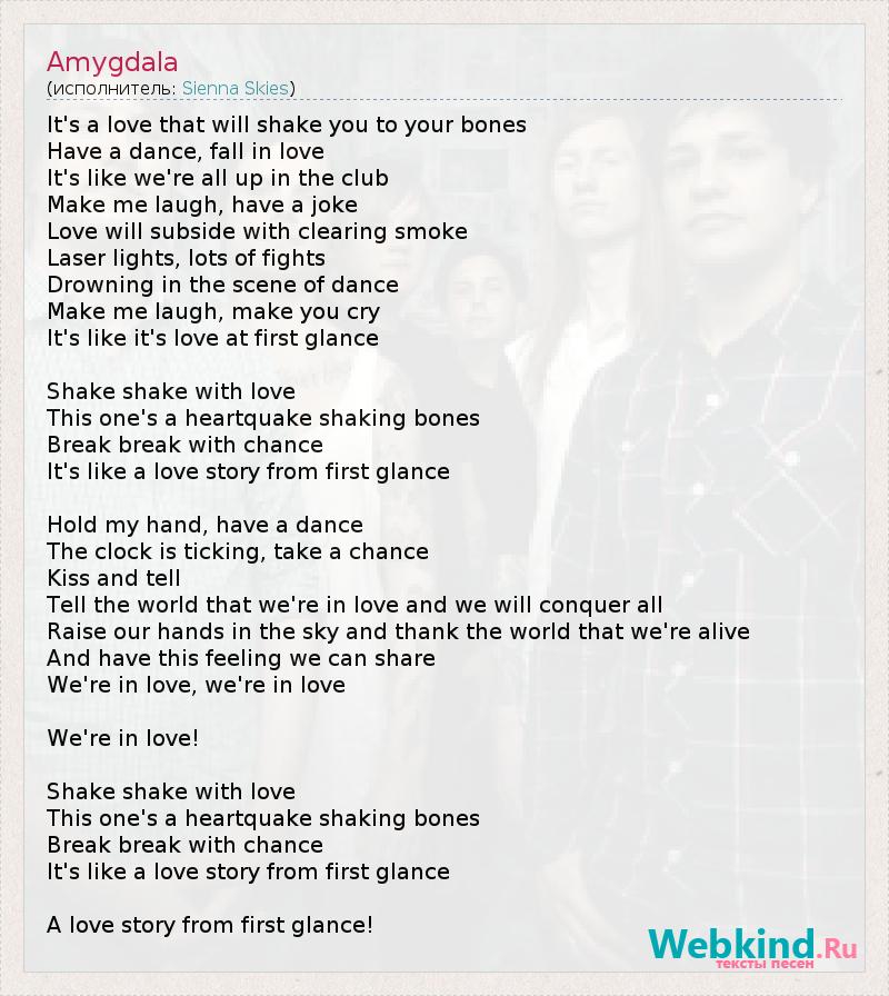 It's a love that will shake you to your bones Have a dance, fall in love It's like we're all up in the club Make me laugh, have a joke Love will subside with clearing smoke Laser lights, lots of fights Drowning in the scene of dance Make me laugh, make you cry It's like it's love at first glance Shake shake with love This one's a heartquake shaking bones Break break with chance It's like a love story from first glance Hold my hand, have a dance The clock is ticking, take a chance Kiss and tell Tell the world that we're in love and we will conquer all Raise our hands in the sky and thank the world that we're alive Аnd have this feeling we can share We're in love, we're in love We're in love! Shake shake with love This one's a heartquake shaking bones Break break with chance It's like a love story from first glance A love story from first glance!