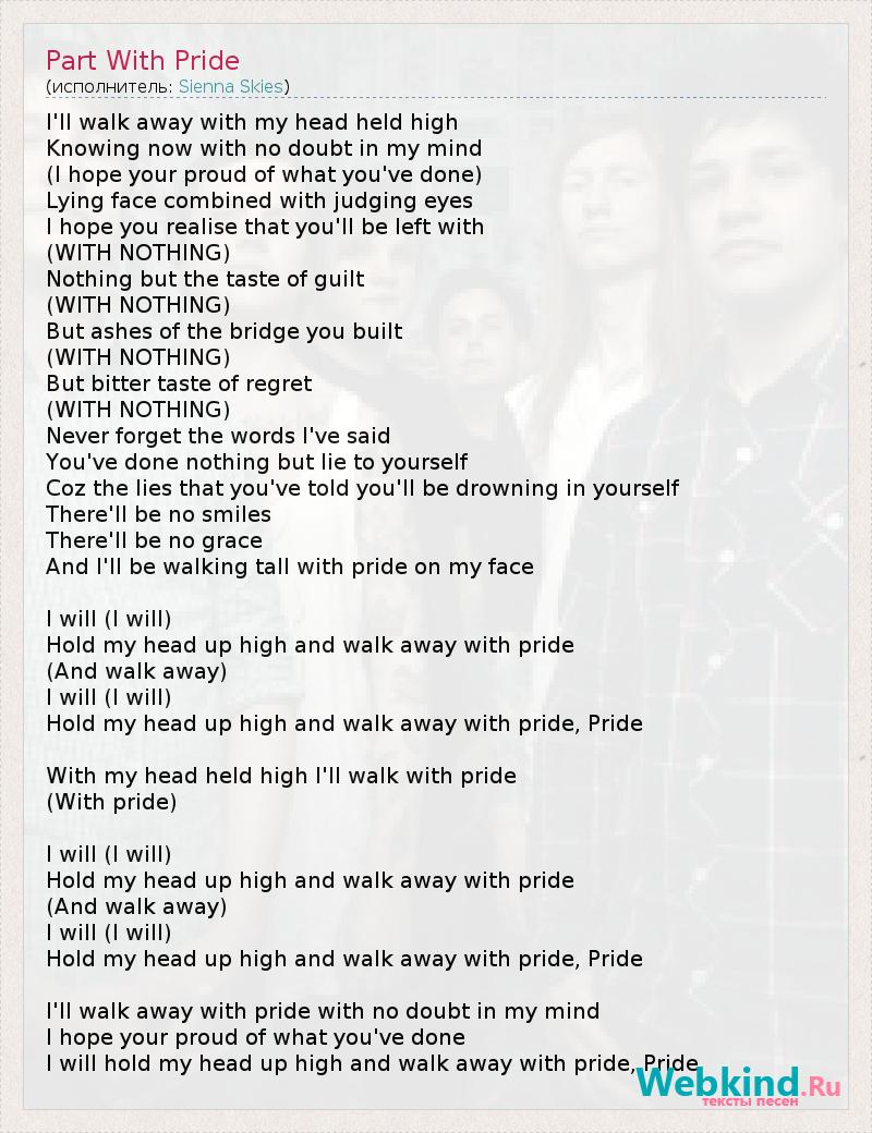 I'll walk away with my head held high Knowing now with no doubt in my mind (I hope your proud of what you've done) Lying face combined with judging eyes I hope you realise that you'll be left with (WITH NOTHING) Nothing but the taste of guilt (WITH NOTHING) But ashes of the bridge you built (WITH NOTHING) But bitter taste of regret (WITH NOTHING) Never forget the words I've said You've done nothing but lie to yourself Coz the lies that you've told you'll be drowning in yourself There'll be no smiles There'll be no grace And I'll be walking tall with pride on my face I will (I will) Hold my head up high and walk away with pride (And walk away) I will (I will) Hold my head up high and walk away with pride, Pride With my head held high I'll walk with pride (With pride) I will (I will) Hold my head up high and walk away with pride (And walk away) I will (I will) Hold my head up high and walk away with pride, Pride I'll walk away with pride with no doubt in my mind I hope your proud of what you've done I will hold my head up high and walk away with pride, Pride