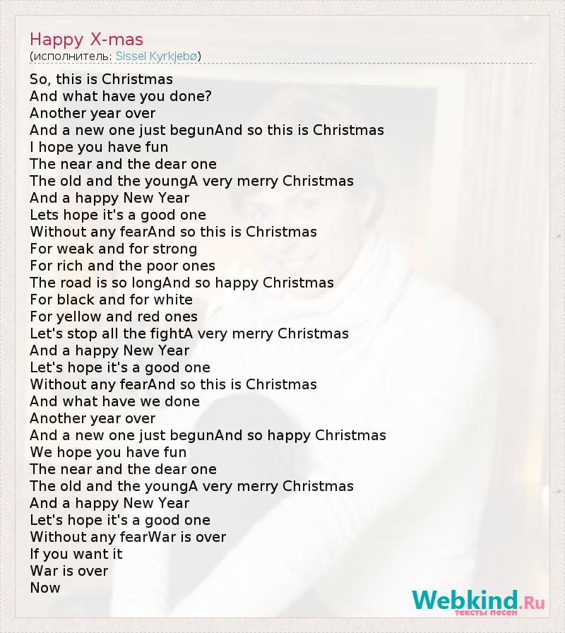 So, this is Christmas And what have you done? Another year over And a new one just begunAnd so this is Christmas I hope you have fun The near and the dear one The old and the youngA very merry Christmas And a happy New Year Lets hope it's a good one Without any fearAnd so this is Christmas For weak and for strong For rich and the poor ones The road is so longAnd so happy Christmas For black and for white For yellow and red ones Let's stop all the fightA very merry Christmas And a happy New Year Let's hope it's a good one Without any fearAnd so this is Christmas And what have we done Another year over And a new one just begunAnd so happy Christmas We hope you have fun The near and the dear one The old and the youngA very merry Christmas And a happy New Year Let's hope it's a good one Without any fearWar is over If you want it War is over Now