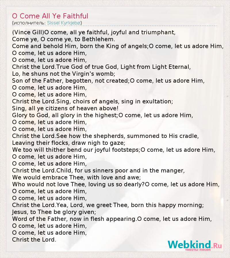 (Vince Gill)O come, all ye faithful, joyful and triumphant, Come ye, O come ye, to Bethlehem. Come and behold Him, born the King of angels;O come, let us adore Him, O come, let us adore Him, O come, let us adore Him, Christ the Lord.True God of true God, Light from Light Eternal, Lo, he shuns not the Virgin's womb; Son of the Father, begotten, not created;O come, let us adore Him, O come, let us adore Him, O come, let us adore Him, Christ the Lord.Sing, choirs of angels, sing in exultation; Sing, all ye citizens of heaven above! Glory to God, all glory in the highest;O come, let us adore Him, O come, let us adore Him, O come, let us adore Him, Christ the Lord.See how the shepherds, summoned to His cradle, Leaving their flocks, draw nigh to gaze; We too will thither bend our joyful footsteps;O come, let us adore Him, O come, let us adore Him, O come, let us adore Him, Christ the Lord.Child, for us sinners poor and in the manger, We would embrace Thee, with love and awe; Who would not love Thee, loving us so dearly?O come, let us adore Him, O come, let us adore Him, O come, let us adore Him, Christ the Lord.Yea, Lord, we greet Thee, born this happy morning; Jesus, to Thee be glory given; Word of the Father, now in flesh appearing.O come, let us adore Him, O come, let us adore Him, O come, let us adore Him, Christ the Lord.