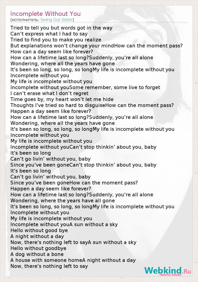 Tried to tell you but words got in the way Can't express what I had to say Tried to find you to make you realize But explanations won't change your mindHow can the moment pass? How can a day seem like forever? How can a lifetime last so long?Suddenly, you're all alone Wondering, where all the years have gone It's been so long, so long, so longMy life is incomplete without you Incomplete without you My life is incomplete without you Incomplete without youSome remember, some live to forget I can't erase what I don't regret Time goes by, my heart won't let me hide Thoughts I've tried so hard to disguiseHow can the moment pass? Happen a day seem like forever? How can a lifetime last so long?Suddenly, you're all alone Wondering, where all the years have gone It's been so long, so long, so longMy life is incomplete without you Incomplete without you My life is incomplete without you Incomplete without youCan't stop thinkin' about you, baby It's been so long Can't go livin' without you, baby Since you've been goneCan't stop thinkin' about you, baby It's been so long Can't go livin' without you, baby Since you've been goneHow can the moment pass? Happen a day seem like forever? How can a lifetime last so long?Suddenly, you're all alone Wondering, where the years have all gone It's been so long, so long, so longMy life is incomplete without you Incomplete without you My life is incomplete without you Incomplete without youA sun without a sky Hello without good bye A night without a day Now, there's nothing left to sayA sun without a sky Hello without goodbye A dog without a bone A house with someone homeA night without a day Now, there's nothing left to say