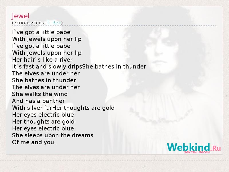 I`ve got a little babe With jewels upon her lip I`ve got a little babe With jewels upon her lip Her hair`s like a river It`s fast and slowly dripsShe bathes in thunder The elves are under her She bathes in thunder The elves are under her She walks the wind And has a panther With silver furHer thoughts are gold Her eyes electric blue Her thoughts are gold Her eyes electric blue She sleeps upon the dreams Of me and you.