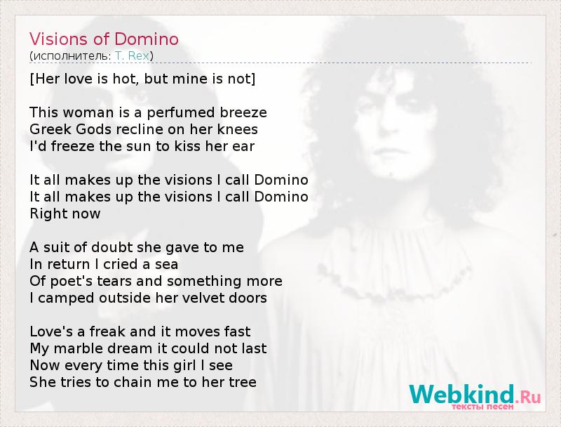 [Her love is hot, but mine is not] This woman is a perfumed breeze Greek Gods recline on her knees I'd freeze the sun to kiss her ear It all makes up the visions I call Domino It all makes up the visions I call Domino Right now A suit of doubt she gave to me In return I cried a sea Of poet's tears and something more I camped outside her velvet doors Love's a freak and it moves fast My marble dream it could not last Now every time this girl I see She tries to chain me to her tree