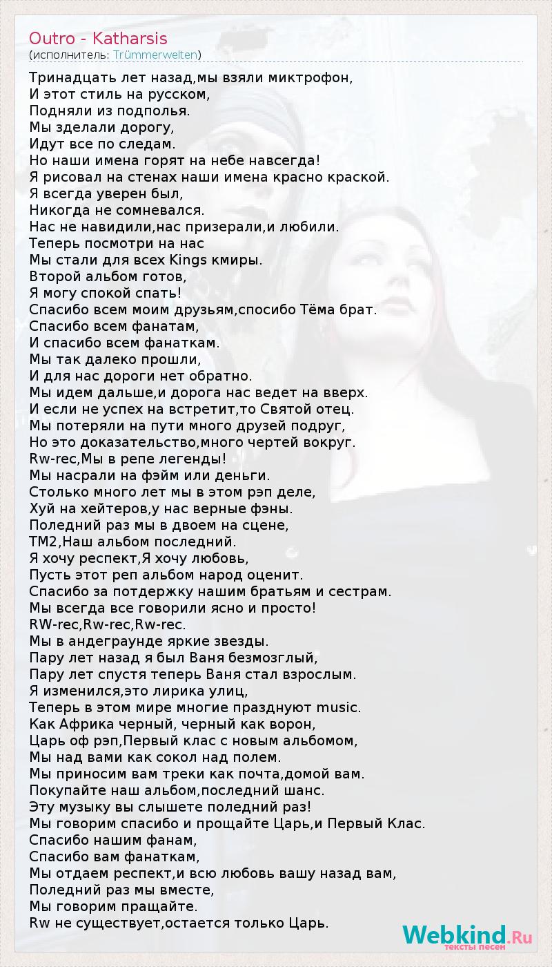 Тринадцать лет назад,мы взяли миктрофон, И этот стиль на русском, Подняли из подполья. Мы зделали дорогу, Идут все по следам. Но наши имена горят на небе навсегда! Я рисовал на стенах наши имена красно краской. Я всегда уверен был, Никогда не сомневался. Нас не навидили,нас призерали,и любили. Теперь посмотри на нас Мы стали для всех Kings кмиры. Второй альбом готов, Я могу спокой спать! Спасибо всем моим друзьям,спосибо Тёма брат. Спасибо всем фанатам, И спасибо всем фанаткам. Мы так далеко прошли, И для нас дороги нет обратно. Мы идем дальше,и дорога нас ведет на вверх. И если не успех на встретит,то Святой отец. Мы потеряли на пути много друзей подруг, Но это доказательство,много чертей вокруг. Rw-rec,Мы в репе легенды! Мы насрали на фэйм или деньги. Столько много лет мы в этом рэп деле, Хуй на хейтеров,у нас верные фэны. Поледний раз мы в двоем на сцене, ТМ2,Наш альбом последний. Я хочу респект,Я хочу любовь, Пусть этот реп альбом народ оценит. Спасибо за потдержку нашим братьям и сестрам. Мы всегда все говорили ясно и просто! RW-rec,Rw-rec,Rw-rec. Мы в андеграунде яркие звезды. Пару лет назад я был Ваня безмозглый, Пару лет спустя теперь Ваня стал взрослым. Я изменился,это лирика улиц, Теперь в этом мире многие празднуют music. Как Африка черный, черный как ворон, Царь оф рэп,Первый клас с новым альбомом, Мы над вами как сокол над полем. Мы приносим вам треки как почта,домой вам. Покупайте наш альбом,последний шанс. Эту музыку вы слышете поледний раз! Мы говорим спасибо и прощайте Царь,и Первый Клас. Спасибо нашим фанам, Спасибо вам фанаткам, Мы отдаем респект,и всю любовь вашу назад вам, Поледний раз мы вместе, Мы говорим пращайте. Rw не существует,остается только Царь.