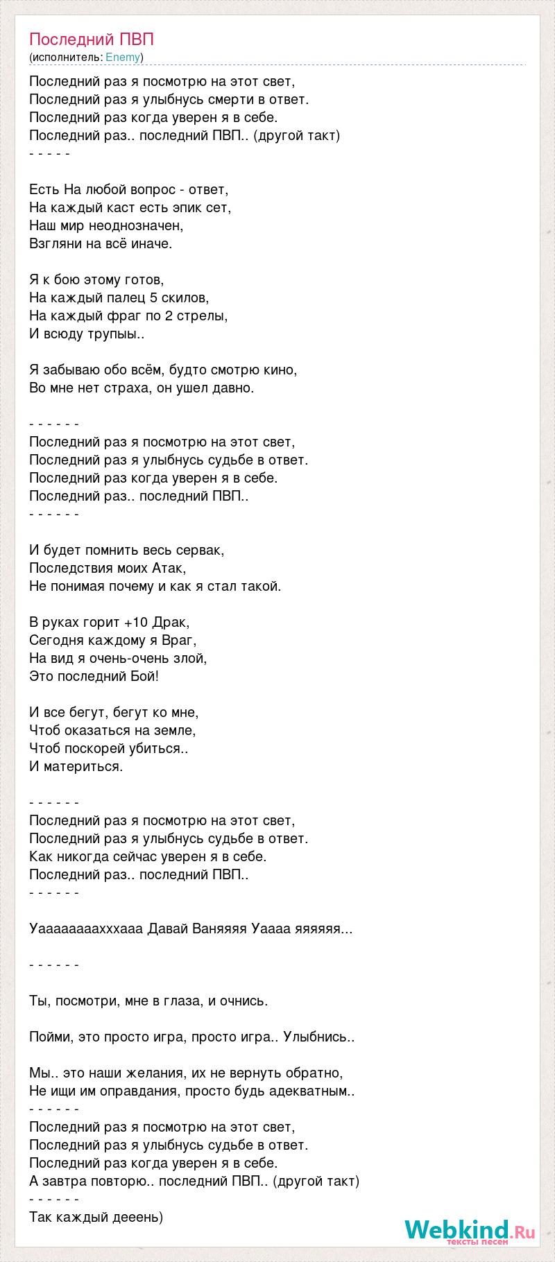 Последний раз я посмотрю на этот свет, Последний раз я улыбнусь смерти в ответ. Последний раз когда уверен я в себе. Последний раз.. последний ПВП.. (другой такт) - - - - - Есть На любой вопрос - ответ, На каждый каст есть эпик сет, Наш мир неоднозначен, Взгляни на всё иначе. Я к бою этому готов, На каждый палец 5 скилов, На каждый фраг по 2 стрелы, И всюду трупыы.. Я забываю обо всём, будто смотрю кино, Во мне нет страха, он ушел давно. - - - - - - Последний раз я посмотрю на этот свет, Последний раз я улыбнусь судьбе в ответ. Последний раз когда уверен я в себе. Последний раз.. последний ПВП.. - - - - - - И будет помнить весь сервак, Последствия моих Атак, Не понимая почему и как я стал такой. В руках горит +10 Драк, Сегодня каждому я Враг, На вид я очень-очень злой, Это последний Бой! И все бегут, бегут ко мне, Чтоб оказаться на земле, Чтоб поскорей убиться.. И материться. - - - - - - Последний раз я посмотрю на этот свет, Последний раз я улыбнусь судьбе в ответ. Как никогда сейчас уверен я в себе. Последний раз.. последний ПВП.. - - - - - - Уаааааааахххааа Давай Ваняяяя Уаааа яяяяяя... - - - - - - Ты, посмотри, мне в глаза, и очнись. Пойми, это просто игра, просто игра.. Улыбнись.. Мы.. это наши желания, их не вернуть обратно, Не ищи им оправдания, просто будь адекватным.. - - - - - - Последний раз я посмотрю на этот свет, Последний раз я улыбнусь судьбе в ответ. Последний раз когда уверен я в себе. А завтра повторю.. последний ПВП.. (другой такт) - - - - - - Так каждый дееень)
