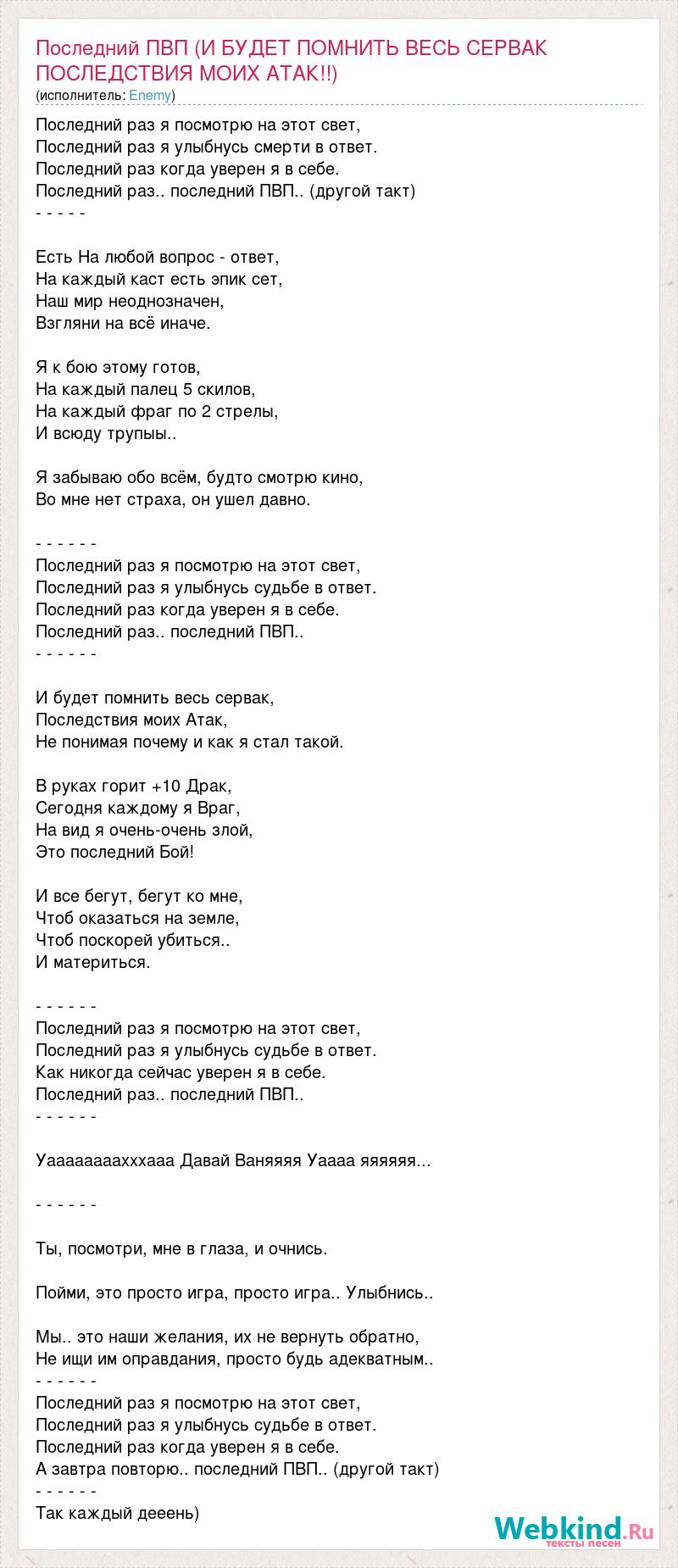 Последний раз я посмотрю на этот свет, Последний раз я улыбнусь смерти в ответ. Последний раз когда уверен я в себе. Последний раз.. последний ПВП.. (другой такт) - - - - - Есть На любой вопрос - ответ, На каждый каст есть эпик сет, Наш мир неоднозначен, Взгляни на всё иначе. Я к бою этому готов, На каждый палец 5 скилов, На каждый фраг по 2 стрелы, И всюду трупыы.. Я забываю обо всём, будто смотрю кино, Во мне нет страха, он ушел давно. - - - - - - Последний раз я посмотрю на этот свет, Последний раз я улыбнусь судьбе в ответ. Последний раз когда уверен я в себе. Последний раз.. последний ПВП.. - - - - - - И будет помнить весь сервак, Последствия моих Атак, Не понимая почему и как я стал такой. В руках горит +10 Драк, Сегодня каждому я Враг, На вид я очень-очень злой, Это последний Бой! И все бегут, бегут ко мне, Чтоб оказаться на земле, Чтоб поскорей убиться.. И материться. - - - - - - Последний раз я посмотрю на этот свет, Последний раз я улыбнусь судьбе в ответ. Как никогда сейчас уверен я в себе. Последний раз.. последний ПВП.. - - - - - - Уаааааааахххааа Давай Ваняяяя Уаааа яяяяяя... - - - - - - Ты, посмотри, мне в глаза, и очнись. Пойми, это просто игра, просто игра.. Улыбнись.. Мы.. это наши желания, их не вернуть обратно, Не ищи им оправдания, просто будь адекватным.. - - - - - - Последний раз я посмотрю на этот свет, Последний раз я улыбнусь судьбе в ответ. Последний раз когда уверен я в себе. А завтра повторю.. последний ПВП.. (другой такт) - - - - - - Так каждый дееень)