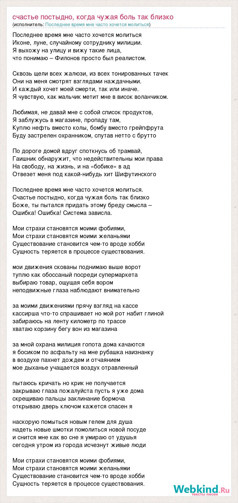 Главная→Исполнители→Последнее время мне часто хочется молиться→Счастье постыдно, когда чужая боль так близко