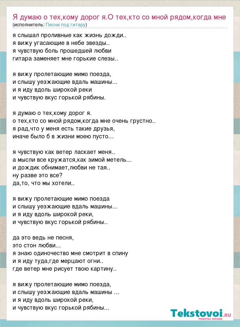 я слышал проливные как жизнь дожди.. я вижу угасающие в небе звезды.. я чувствую боль прошедшей любви гитара заменяет мне горькие слезы.. я вижу пролетающие мимо поезда, и слышу уезжающие вдаль машины... и я иду вдоль широкой реки и чувствую вкус горькой рябины. я думаю о тех,кому дорог я. о тех,кто со мной рядом,когда мне очень грустно.. я рад,что у меня есть такие друзья, иначе было б в жизни моею пусто... я чувствую как ветер ласкает меня.. а мысли все кружатся,как зимой метель... и дождик обнимает,любви не тая.. ну разве это все? да,то, что мы хотели.. я вижу пролетающие мимо поезда и слышу уезжающие вдаль машины... и я иду вдоль широкой реки, и чувствую вкус горькой рябины.. да это ведь не песня, это стон любви... я знаю одиночество мне смотрит в спину и я иду туда,где мерцают огни.. где ветер мне рисует твою картину.. я вижу пролетающие мимо поезда, и слышу уезжающие вдаль машины ... и я иду вдоль широкой реки, и чувствую вкус горькой рябины...