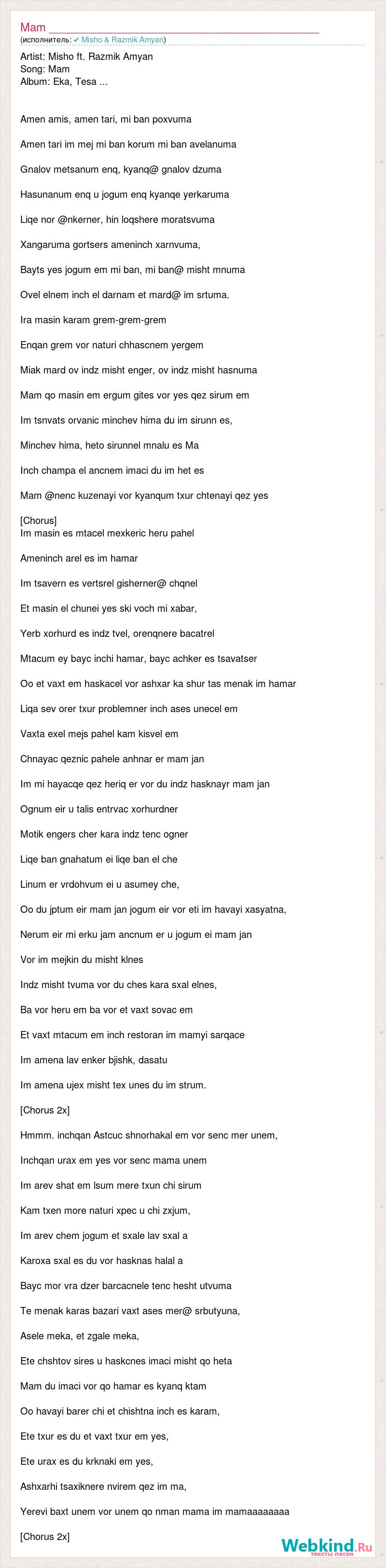 Artist: Misho ft. Razmik Amyan Song: Mam Album: Eka, Tesa ... Amen amis, amen tari, mi ban poxvuma Amen tari im mej mi ban korum mi ban avelanuma Gnalov metsanum enq, kyanq@ gnalov dzuma Hasunanum enq u jogum enq kyanqe yerkaruma Liqe nor @nkerner, hin loqshere moratsvuma Xangaruma gortsers ameninch xarnvuma, Bayts yes jogum em mi ban, mi ban@ misht mnuma Ovel elnem inch el darnam et mard@ im srtuma. Ira masin karam grem-grem-grem Enqan grem vor naturi chhascnem yergem Miak mard ov indz misht enger, ov indz misht hasnuma Mam qo masin em ergum gites vor yes qez sirum em Im tsnvats orvanic minchev hima du im sirunn es, Minchev hima, heto sirunnel mnalu es Ma Inch champa el ancnem imaci du im het es Mam @nenc kuzenayi vor kyanqum txur chtenayi qez yes [Chorus] Im masin es mtacel mexkeric heru pahel Ameninch arel es im hamar Im tsavern es vertsrel gisherner@ chqnel Et masin el chunei yes ski voch mi xabar, Yerb xorhurd es indz tvel, orenqnere bacatrel Mtacum ey bayc inchi hamar, bayc achker es tsavatser Oo et vaxt em haskacel vor ashxar ka shur tas menak im hamar Liqa sev orer txur problemner inch ases unecel em Vaxta exel mejs pahel kam kisvel em Chnayac qeznic pahele anhnar er mam jan Im mi hayacqe qez heriq er vor du indz hasknayr mam jan Ognum eir u talis entrvac xorhurdner Motik engers cher kara indz tenc ogner Liqe ban gnahatum ei liqe ban el che Linum er vrdohvum ei u asumey che, Oo du jptum eir mam jan jogum eir vor eti im havayi xasyatna, Nerum eir mi erku jam ancnum er u jogum ei mam jan Vor im mejkin du misht klnes Indz misht tvuma vor du ches kara sxal elnes, Ba vor heru em ba vor et vaxt sovac em Et vaxt mtacum em inch restoran im mamyi sarqace Im amena lav enker bjishk, dasatu Im amena ujex misht tex unes du im strum. [Chorus 2x] Hmmm. inchqan Astcuc shnorhakal em vor senc mer unem, Inchqan urax em yes vor senc mama unem Im arev shat em lsum mere txun chi sirum Kam txen more naturi xpec u chi zxjum, Im arev chem jogum et sxale lav sxal a Karoxa sxal es du vor hasknas halal a Bayc mor vra dzer barcacnele tenc hesht utvuma Te menak karas bazari vaxt ases mer@ srbutyuna, Asele meka, et zgale meka, Ete chshtov sires u haskcnes imaci misht qo heta Mam du imaci vor qo hamar es kyanq ktam Oo havayi barer chi et chishtna inch es karam, Ete txur es du et vaxt txur em yes, Ete urax es du krknaki em yes, Ashxarhi tsaxiknere nvirem qez im ma, Yerevi baxt unem vor unem qo nman mama im mamaaaaaaaa [Chorus 2x]