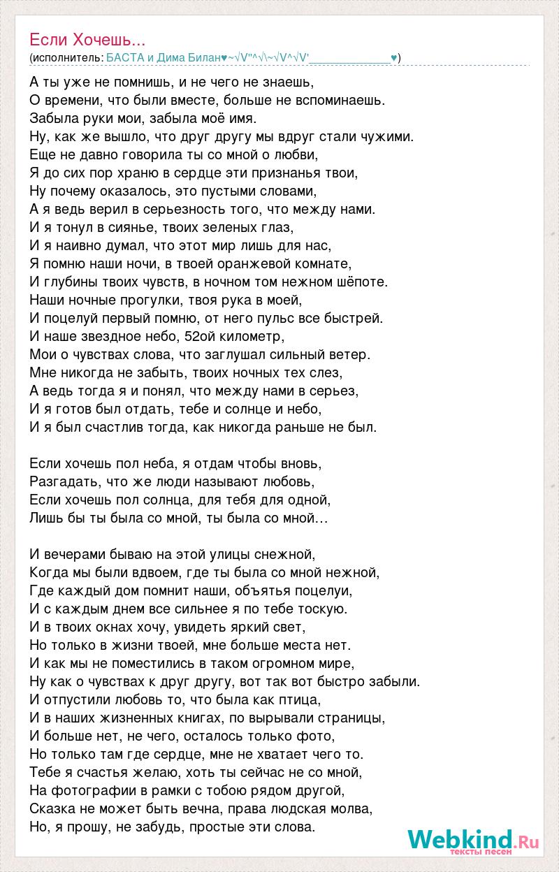 А ты уже не помнишь, и не чего не знаешь, О времени, что были вместе, больше не вспоминаешь. Забыла руки мои, забыла моё имя. Ну, как же вышло, что друг другу мы вдруг стали чужими. Еще не давно говорила ты со мной о любви, Я до сих пор храню в сердце эти признанья твои, Ну почему оказалось, это пустыми словами, А я ведь верил в серьезность того, что между нами. И я тонул в сиянье, твоих зеленых глаз, И я наивно думал, что этот мир лишь для нас, Я помню наши ночи, в твоей оранжевой комнате, И глубины твоих чувств, в ночном том нежном шёпоте. Наши ночные прогулки, твоя рука в моей, И поцелуй первый помню, от него пульс все быстрей. И наше звездное небо, 52ой километр, Мои о чувствах слова, что заглушал сильный ветер. Мне никогда не забыть, твоих ночных тех слез, А ведь тогда я и понял, что между нами в серьез, И я готов был отдать, тебе и солнце и небо, И я был счастлив тогда, как никогда раньше не был. Если хочешь пол неба, я отдам чтобы вновь, Разгадать, что же люди называют любовь, Если хочешь пол солнца, для тебя для одной, Лишь бы ты была со мной, ты была со мной… И вечерами бываю на этой улицы снежной, Когда мы были вдвоем, где ты была со мной нежной, Где каждый дом помнит наши, объятья поцелуи, И с каждым днем все сильнее я по тебе тоскую. И в твоих окнах хочу, увидеть яркий свет, Но только в жизни твоей, мне больше места нет. И как мы не поместились в таком огромном мире, Ну как о чувствах к друг другу, вот так вот быстро забыли. И отпустили любовь то, что была как птица, И в наших жизненных книгах, по вырывали страницы, И больше нет, не чего, осталось только фото, Но только там где сердце, мне не хватает чего то. Тебе я счастья желаю, хоть ты сейчас не со мной, На фотографии в рамки с тобою рядом другой, Сказка не может быть вечна, права людская молва, Но, я прошу, не забудь, простые эти слова.