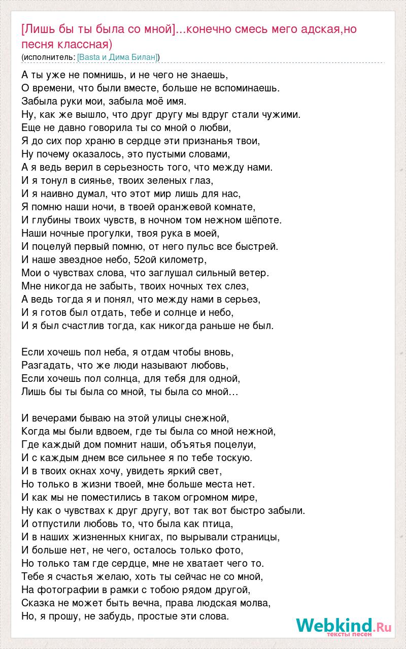 А ты уже не помнишь, и не чего не знаешь, О времени, что были вместе, больше не вспоминаешь. Забыла руки мои, забыла моё имя. Ну, как же вышло, что друг другу мы вдруг стали чужими. Еще не давно говорила ты со мной о любви, Я до сих пор храню в сердце эти признанья твои, Ну почему оказалось, это пустыми словами, А я ведь верил в серьезность того, что между нами. И я тонул в сиянье, твоих зеленых глаз, И я наивно думал, что этот мир лишь для нас, Я помню наши ночи, в твоей оранжевой комнате, И глубины твоих чувств, в ночном том нежном шёпоте. Наши ночные прогулки, твоя рука в моей, И поцелуй первый помню, от него пульс все быстрей. И наше звездное небо, 52ой километр, Мои о чувствах слова, что заглушал сильный ветер. Мне никогда не забыть, твоих ночных тех слез, А ведь тогда я и понял, что между нами в серьез, И я готов был отдать, тебе и солнце и небо, И я был счастлив тогда, как никогда раньше не был. Если хочешь пол неба, я отдам чтобы вновь, Разгадать, что же люди называют любовь, Если хочешь пол солнца, для тебя для одной, Лишь бы ты была со мной, ты была со мной… И вечерами бываю на этой улицы снежной, Когда мы были вдвоем, где ты была со мной нежной, Где каждый дом помнит наши, объятья поцелуи, И с каждым днем все сильнее я по тебе тоскую. И в твоих окнах хочу, увидеть яркий свет, Но только в жизни твоей, мне больше места нет. И как мы не поместились в таком огромном мире, Ну как о чувствах к друг другу, вот так вот быстро забыли. И отпустили любовь то, что была как птица, И в наших жизненных книгах, по вырывали страницы, И больше нет, не чего, осталось только фото, Но только там где сердце, мне не хватает чего то. Тебе я счастья желаю, хоть ты сейчас не со мной, На фотографии в рамки с тобою рядом другой, Сказка не может быть вечна, права людская молва, Но, я прошу, не забудь, простые эти слова.