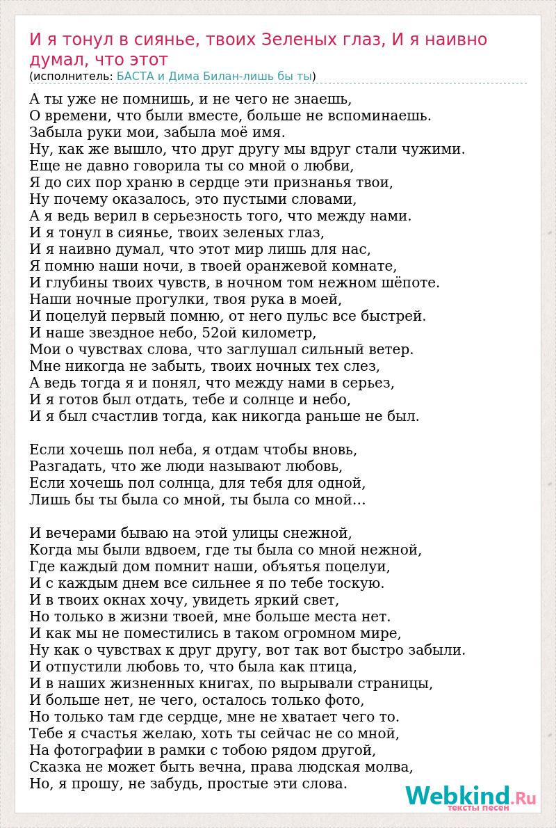 Главная→Исполнители→БАСТА и Дима Билан-лишь бы ты→И я тонул в сиянье, твоих Зеленых глаз, И я наивно думал, что этот