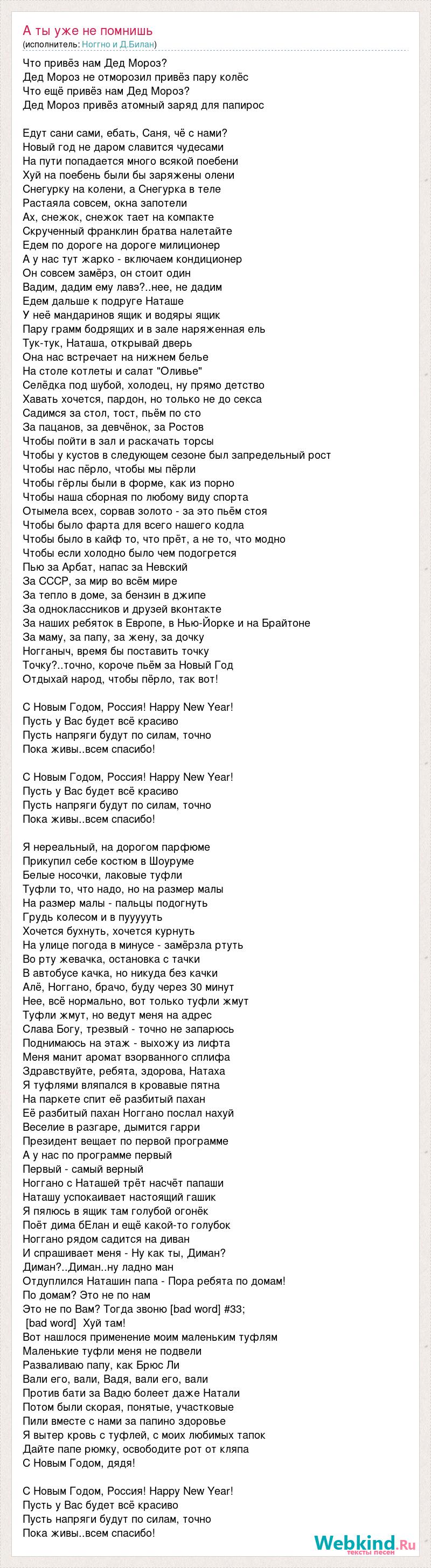 Что привёз нам Дед Мороз? Дед Мороз не отморозил привёз пару колёс Что ещё привёз нам Дед Мороз? Дед Мороз привёз атомный заряд для папирос Едут сани сами, ебать, Саня, чё с нами? Новый год не даром славится чудесами На пути попадается много всякой поебени Хуй на поебень были бы заряжены олени Снегурку на колени, а Снегурка в теле Растаяла совсем, окна запотели Ах, снежок, снежок тает на компакте Скрученный франклин братва налетайте Едем по дороге на дороге милиционер А у нас тут жарко - включаем кондиционер Он совсем замёрз, он стоит один Вадим, дадим ему лавэ?..нее, не дадим Едем дальше к подруге Наташе У неё мандаринов ящик и водяры ящик Пару грамм бодрящих и в зале наряженная ель Тук-тук, Наташа, открывай дверь Она нас встречает на нижнем белье На столе котлеты и салат "Оливье" Селёдка под шубой, холодец, ну прямо детство Хавать хочется, пардон, но только не до секса Садимся за стол, тост, пьём по сто За пацанов, за девчёнок, за Ростов Чтобы пойти в зал и раскачать торсы Чтобы у кустов в следующем сезоне был запредельный рост Чтобы нас пёрло, чтобы мы пёрли Чтобы гёрлы были в форме, как из порно Чтобы наша сборная по любому виду спорта Отымела всех, сорвав золото - за это пьём стоя Чтобы было фарта для всего нашего кодла Чтобы было в кайф то, что прёт, а не то, что модно Чтобы если холодно было чем подогрется Пью за Арбат, напас за Невский За СССР, за мир во всём мире За тепло в доме, за бензин в джипе За одноклассников и друзей вконтакте За наших ребяток в Европе, в Нью-Йорке и на Брайтоне За маму, за папу, за жену, за дочку Ногганыч, время бы поставить точку Точку?..точно, короче пьём за Новый Год Отдыхай народ, чтобы пёрло, так вот! С Новым Годом, Россия! Happy New Year! Пусть у Вас будет всё красиво Пусть напряги будут по силам, точно Пока живы..всем спасибо! С Новым Годом, Россия! Happy New Year! Пусть у Вас будет всё красиво Пусть напряги будут по силам, точно Пока живы..всем спасибо! Я нереальный, на дорогом парфюме Прикупил себе костюм в Шоуруме Белые носочки, лаковые туфли Туфли то, что надо, но на размер малы На размер малы - пальцы подогнуть Грудь колесом и в пуууууть Хочется бухнуть, хочется курнуть На улице погода в минусе - замёрзла ртуть Во рту жевачка, остановка с тачки В автобусе качка, но никуда без качки Алё, Ноггано, брачо, буду через 30 минут Нее, всё нормально, вот только туфли жмут Туфли жмут, но ведут меня на адрес Слава Богу, трезвый - точно не запарюсь Поднимаюсь на этаж - выхожу из лифта Меня манит аромат взорванного сплифа Здравствуйте, ребята, здорова, Натаха Я туфлями вляпался в кровавые пятна На паркете спит её разбитый пахан Её разбитый пахан Ноггано послал нахуй Веселие в разгаре, дымится гарри Президент вещает по первой программе А у нас по программе первый Первый - самый верный Ноггано с Наташей трёт насчёт папаши Наташу успокаивает настоящий гашик Я пялюсь в ящик там голубой огонёк Поёт дима бЕлан и ещё какой-то голубок Ноггано рядом садится на диван И спрашивает меня - Ну как ты, Диман? Диман?..Диман..ну ладно ман Отдуплился Наташин папа - Пора ребята по домам! По домам? Это не по нам Это не по Вам? Тогда звоню [bad word] #33; [bad word] Хуй там! Вот нашлося применение моим маленьким туфлям Маленькие туфли меня не подвели Разваливаю папу, как Брюс Ли Вали его, вали, Вадя, вали его, вали Против бати за Вадю болеет даже Натали Потом были скорая, понятые, участковые Пили 